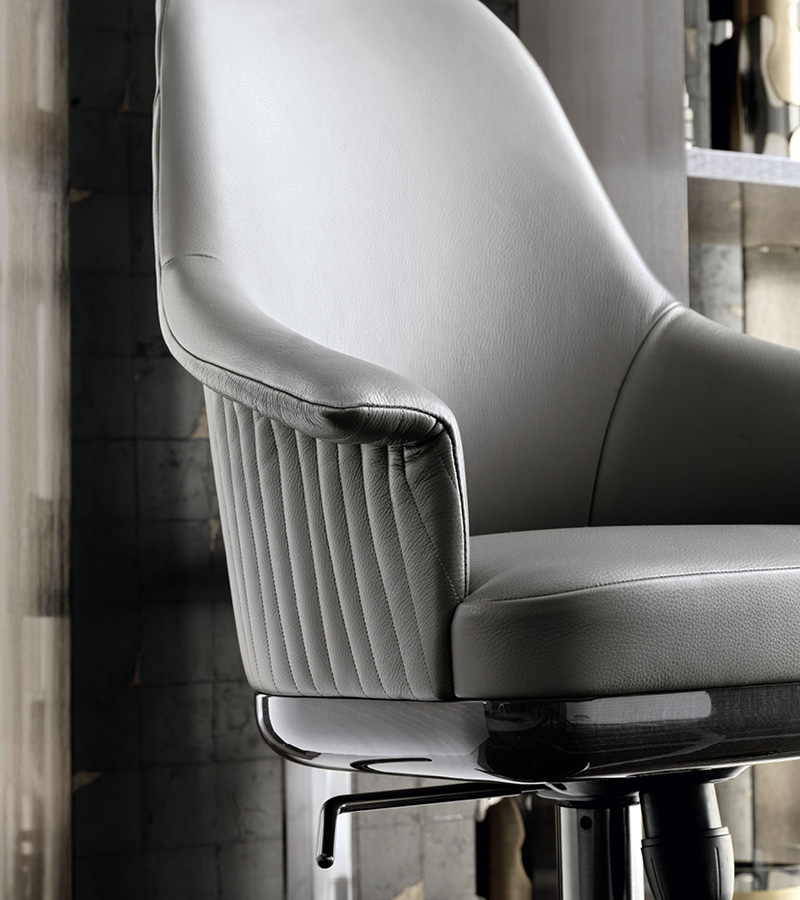 Fully upholstered home office chair in solid beech on wheels with adjustable seat height (cm. 44/52). Back in quilted first grade leather, nubuk leather, lizard printed leather, velvet or suede fabric. Wooden frame seat with Giorgio Collection logo. Base in satin black nickel stainless steel.