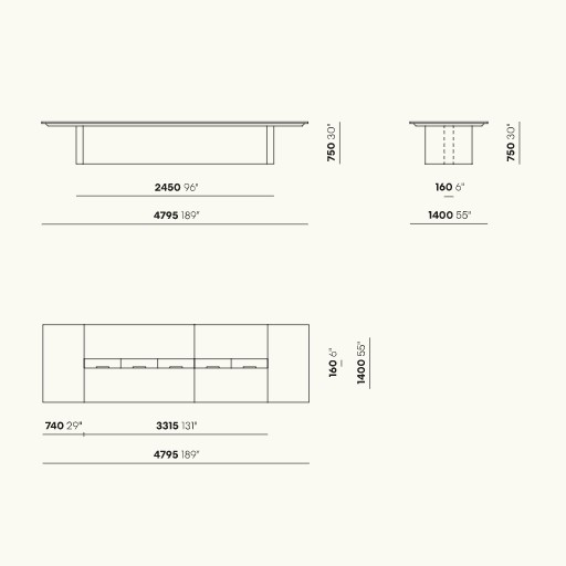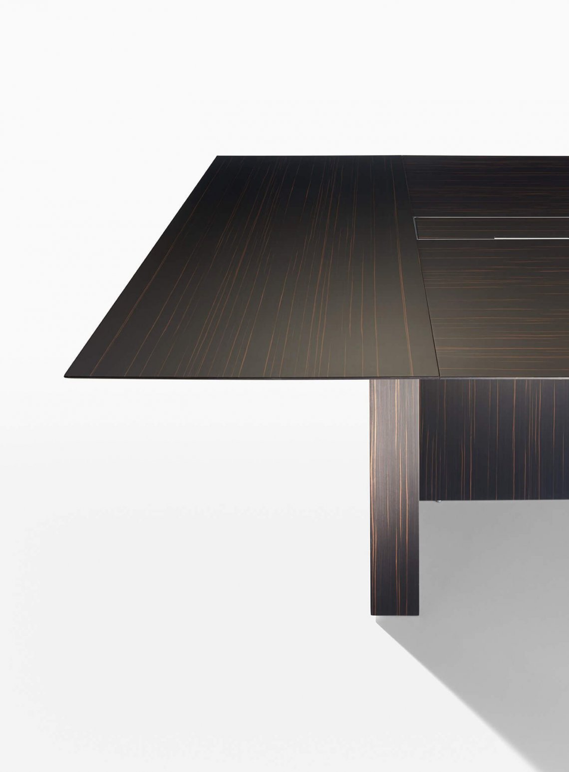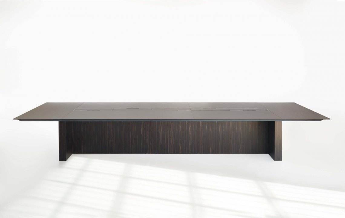 More is a system of tables for executive offices and meeting rooms, with a refined style. It is characterised by important volumes and a harmonious alternation between massive elements and light surfaces. A central architectural element connects the technical volumes and the work surfaces. Side cabinets and worksurface electrification complete the system.