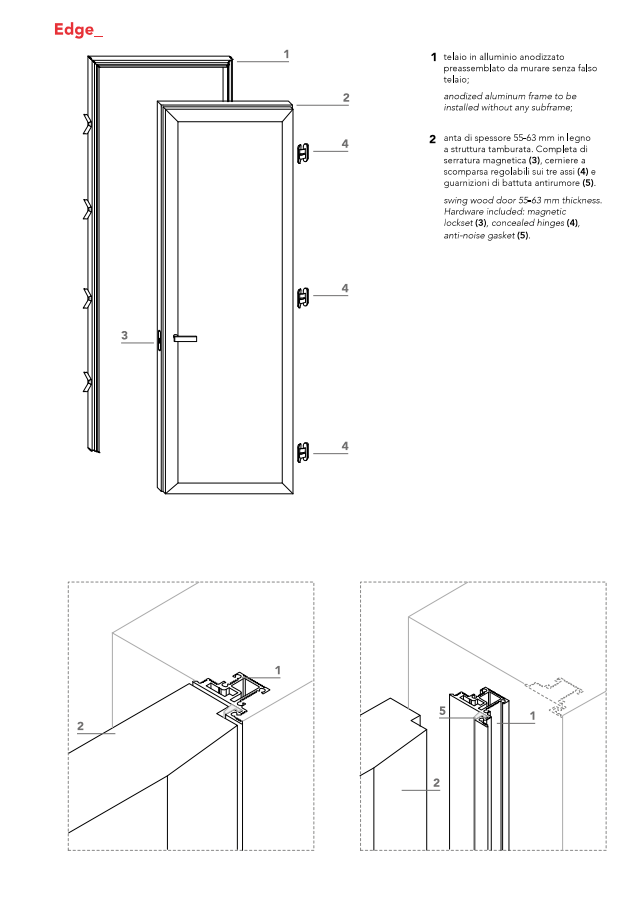 Swing wood door 55 mm thick with a concealed incorporated handle. The handle operates by pressing the vertical band, which is always lacquered in opaque color. Magnetic lockset, concealed door closer, concealed hinges and anti-noise gasket included. Aluminum frame to be installed withoutg any subframe.