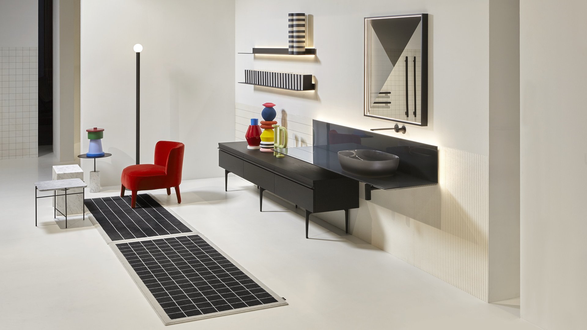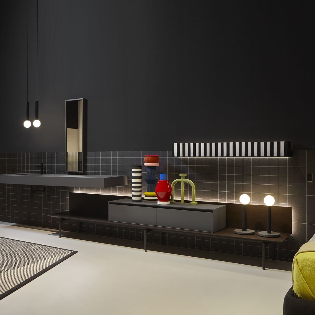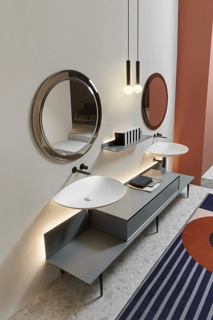 Un progetto essenziale nella forma quanto articolato nella funzione, un sistema componibile che parte da un elemento base per declinarsi in molti modi diversi, un concept che nasce dalla definizione di una semplice mensola a “L” che diventa piano d’appoggio su cui posizionare contenitori, lavabi, accessori e oggetti per l’ambiente bagno e non solo. Un corpo semplice e lineare ancorato alla parete, disponibile nella versione laccata o in essenza legno, che fa da supporto a elementi diversi per forma, materiali e colori.