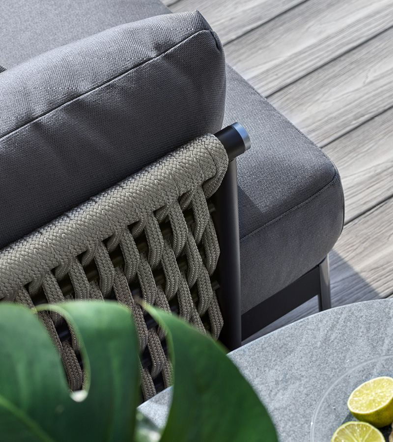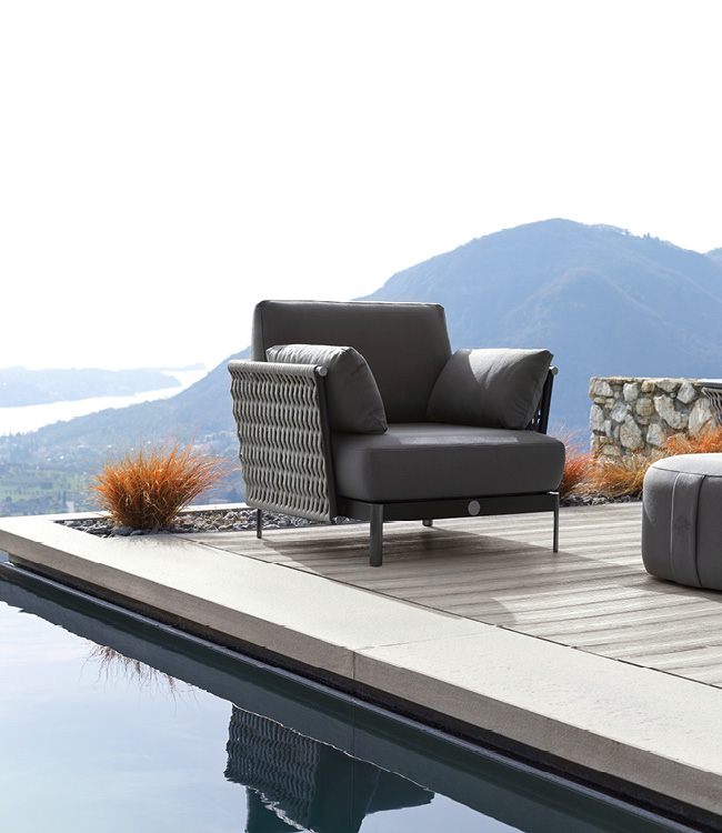 Outdoor occasional chair available in special treated fabric or first grade leather. Cushion filling in waterproof dacron. Structure in combination of satined black metal with inserted Giorgio Collection logo and light grey or black woven cordage.