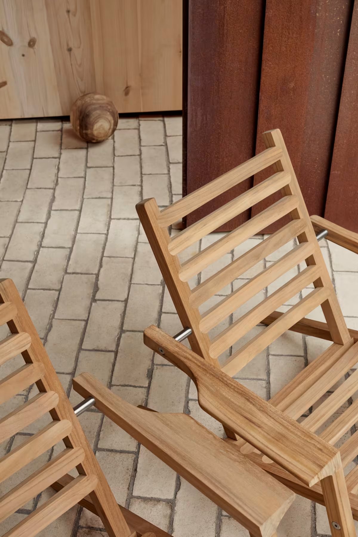 The comfortable Outdoor Deck chair is part of the AH Outdoor series, designed by Alfred Homann in 2022. Like the other outdoor furniture in the series, the deck chair is characterized by strict lines elegantly combined with soft, rounded details. Comfort is paramount with carefully measured angles in the seat and backrest. The deck chair is made of FSC?-certified teak, a hardy type of wood that patinas beautifully over time. The cushion is sold separately.