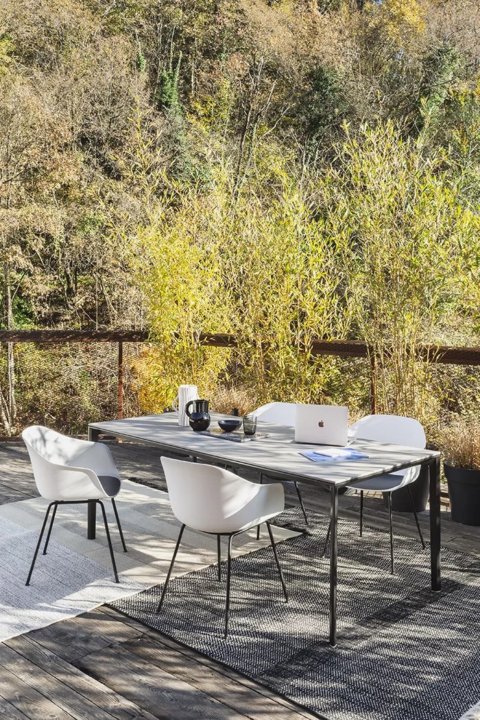 Nelle sue proporzioni perfette, in bianco e in nero per risaltare l’essenzialità delle linee, il tavolo ADD T Square prosegue outdoor l’eleganza minimale e la convivialità del sistema ADD. Il piano è in laminato HPL Fenix?. E grazie alle gambe in fusione di alluminio, che formano l’angolo nella versione singola e permettono di unire i telai, le soluzioni compositive non conoscono limiti.