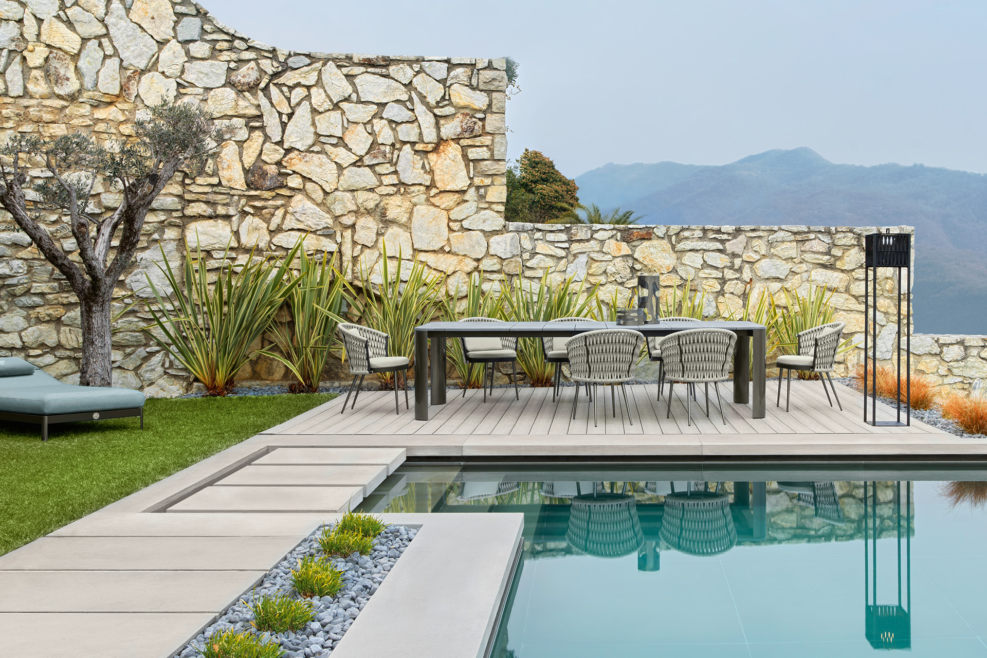Outdoor Rectangular table with top made by slats of treated "CARDOSO" natural stone with inserted Giorgio Collection logo. Legs in satined black metal.