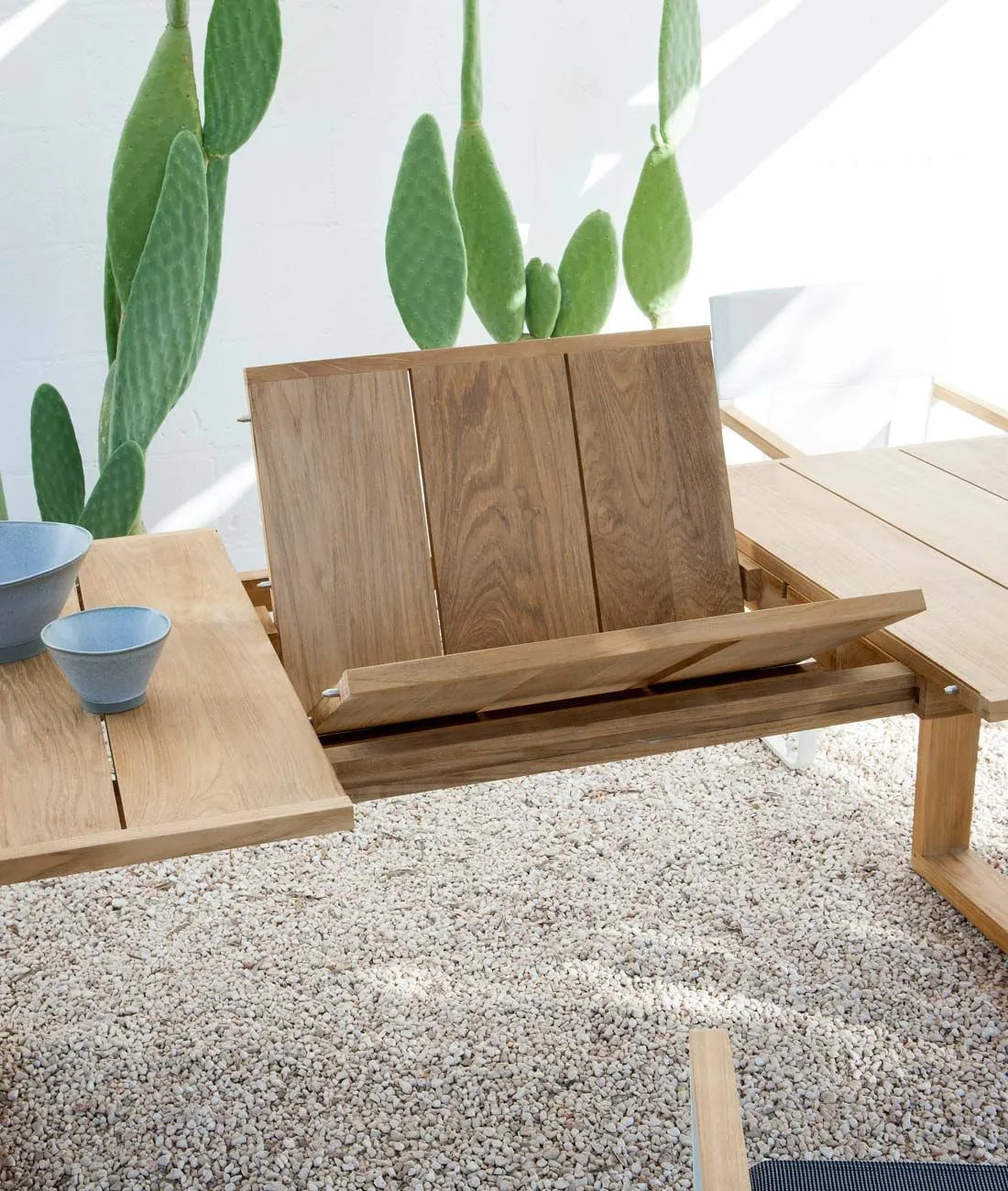 La collezione Cosette abbina il calore del teak alla praticità del tessuto. La poltroncina da regista, intramontabile e versatile, si accosta al tavolo in teak dal design pulito e minimale che da quest’anno completa la linea.
