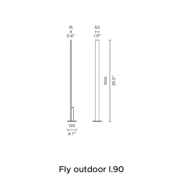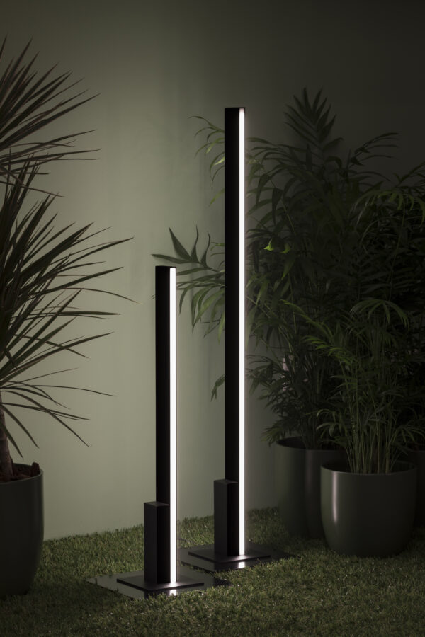 Fly Outdoor è proposta anche in due diverse altezze, 60 o 90 cm, con doppia emissione luminosa. La protezione IP65 la rende ideale per l'uso all'aperto, in zone di passaggio, carrabili, ma anche giardini.