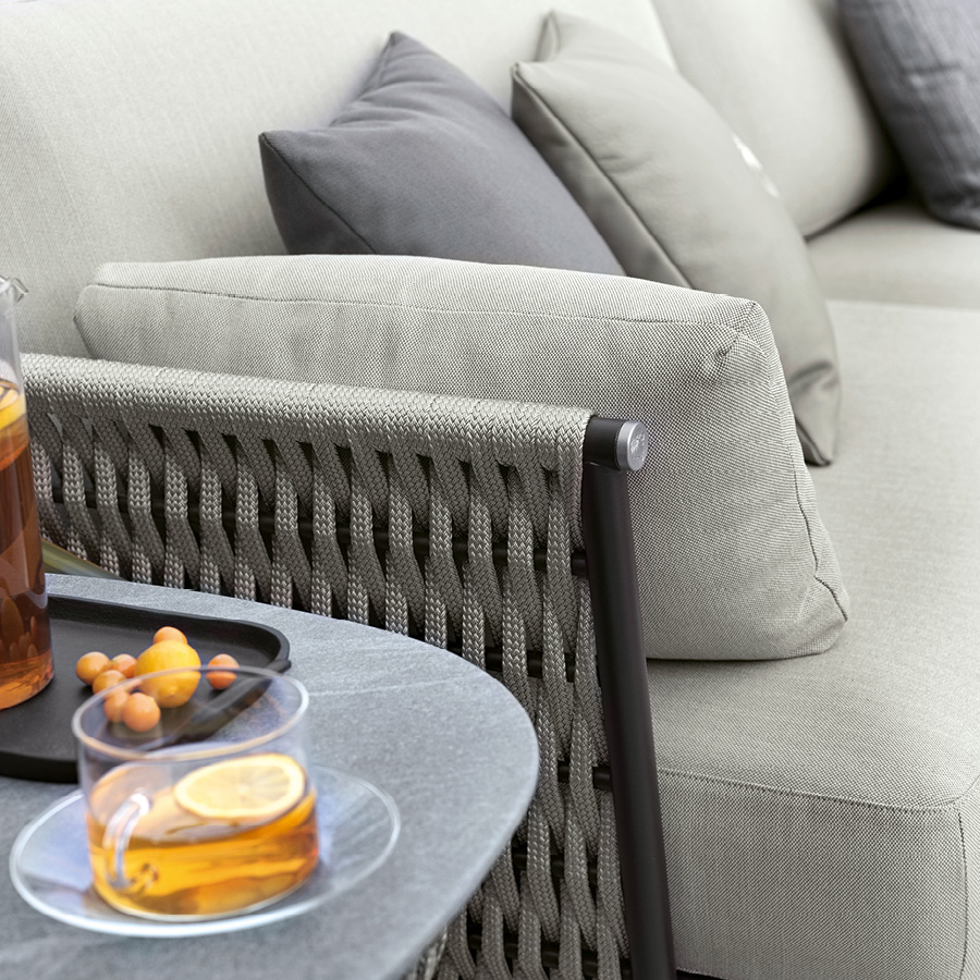 Sofa available in special treated fabric or first grade leather. Cushion filling in waterproof dacron. Structure in combination of satined black metal with inserted Giorgio Collection logo and light grey or black woven cordage.