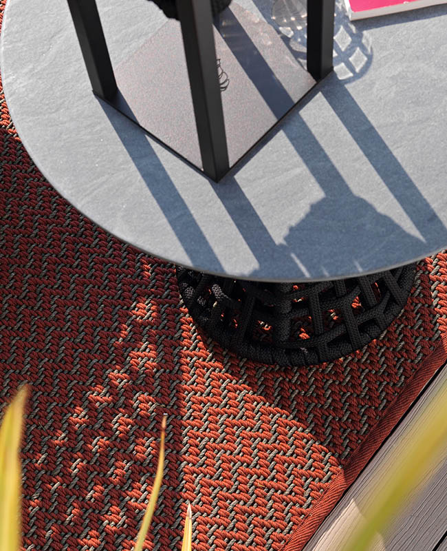 Outdoor side table in combination of satined black metal treated in cataphoresism and woven cordage. Top in treated CARDOSO natural stone with inserted Giorgio Collection logo.