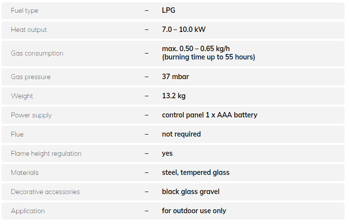 Rio is a black powder coat finish fireplace made of durable high quality materials, resistant to weather conditions. Enjoy the real golden flames up to 55 hours with this gas powered fireplace. Its small and compact size along with portable solution allows you to place it wherever you want on your terrace or around your garden. See-through glass panel stabilizes the fire and black glass gravels make an attractive addition.