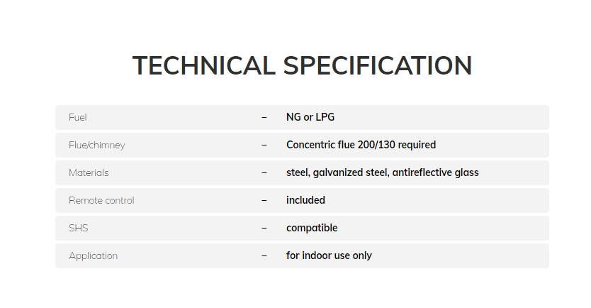 Valentino is a long gas fireplace with a three-section linear burner. It comes in two sizes, 1000 mm and 1300 mm, and is connected to a balanced flue. Shipped standard with antireflective glass panels and decorative logs, chips and black vermiculite. Valentino direct vent fireplace provides convenient control with a remote, smartphone and Smart Home Automation.