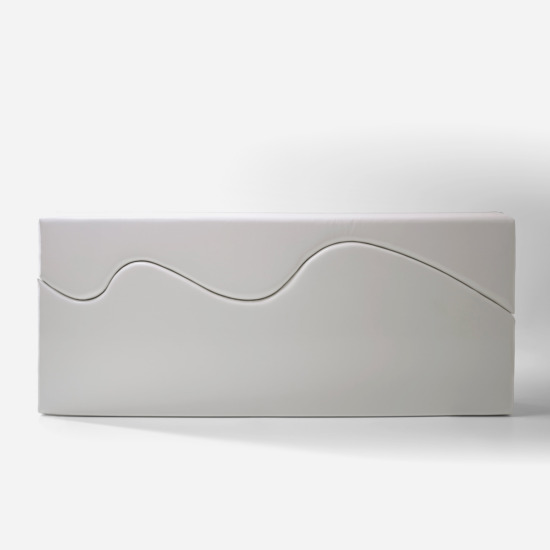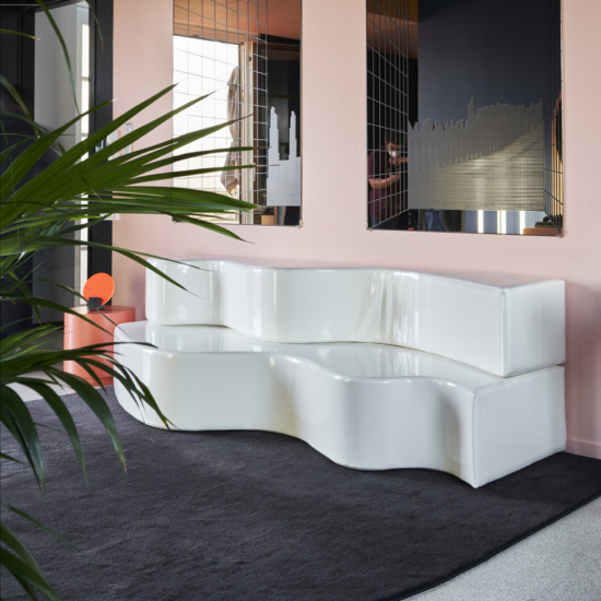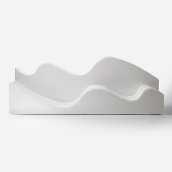Designed in 1967 by the Florentine Radical group Archizoom, this was the first sofa without a conventional frame. It is composed of two waves made from a polyurethane block cut into two parts with an S—shaped incision, which can be interlocked and stacked to produce different configurations. The lightness and modular design permit a range of various uses: Superonda can be a sofa, a bed or a chaise longue. Like many of the pieces designed by the Archizoom group, it challenges bourgeois conventions, stimulating the creativity and fantasy of the user. The shiny leatherette cover in the basic colors of white, black and red accentuates the pop image.