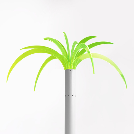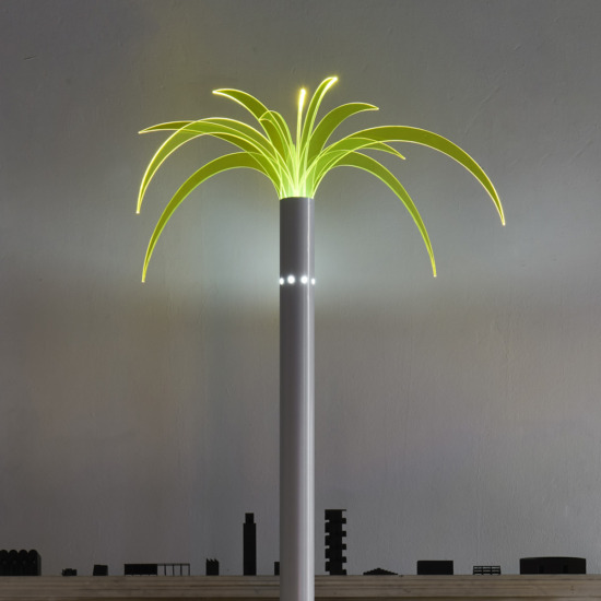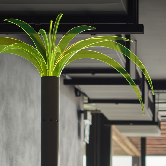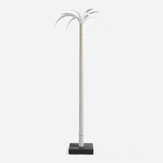 The prototype of the Sanremo floor lamp was an engagement present from Dario Bartolini to Lucia Morozzi, given to her in the villa in Roccamare designed by Ernesto Nathan Rogers. Sanremo is composed of a slender metal trunk topped by “foliage” like that of a stylized palm tree, formed by lanceolate transparent or fluorescent green methacrylate leaves that radiate light. The prototype also called for a sound similar to the song of a cricket, eliminated in the production version.