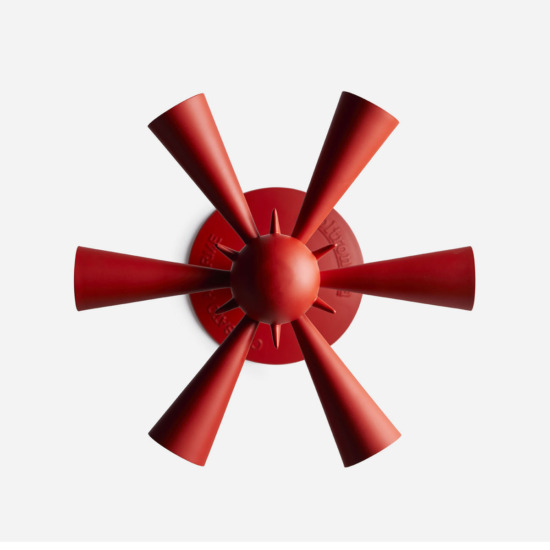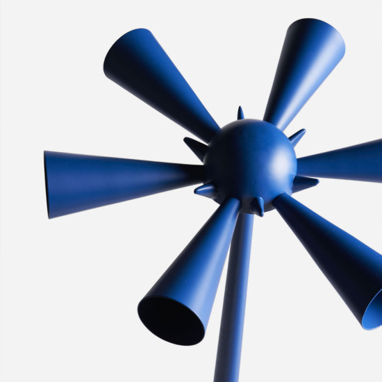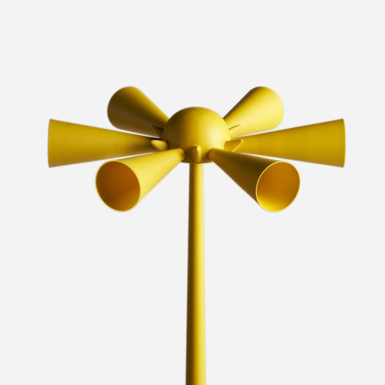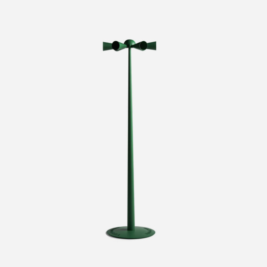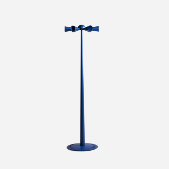 The Cessato Allarme clothes—stand, created in 1986 by the De Pas, D’Urbino, Lomazzi studio, put into production by Poltronova in 1991, reveals its source of inspiration in its name [“Alarm Over!”]: the alarm—trumpets placed on light poles during the last war. Made of metal, available in bright colours, there is nothing warlike about it, indeed it has a cheerful pop touch, emphasised by the unusual name which, as Paolo Lomazzi suggests, in this beginning of winter 2020, is a metaphorical call to “go and blow the trumpets again”.