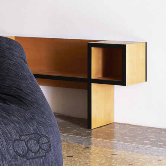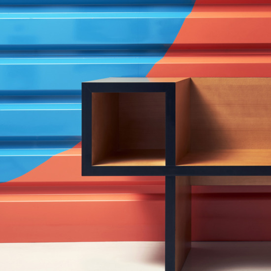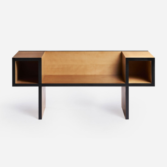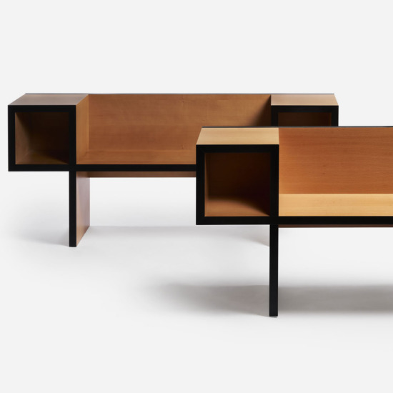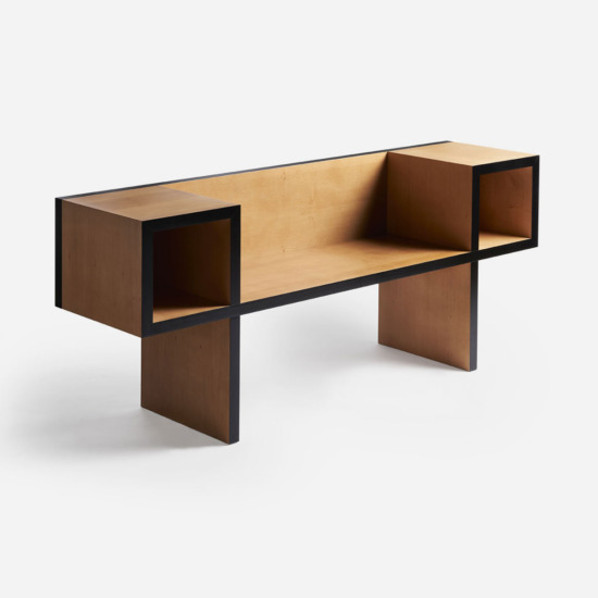 The Canton wooden bench, designed by Franco Raggi in 1988, fitted out with two spaces on the sides—containers for magazines, books and phone directories, still in use at the time—ideally designed for home entrances, ?was born, —Franco Raggi writes—, from a graphic exercise: a black line which in its continuous path creates two squares connected by a horizontal line. Dragging this line into the third dimension, I realised that the solid thus obtained could be a bench, not a comfortable seat, but for temporary use, where ergonomics could be sacrifice in favour of an abstract, almost neoplastic image. Books and things could be put in the squares transformed into open compartments.?