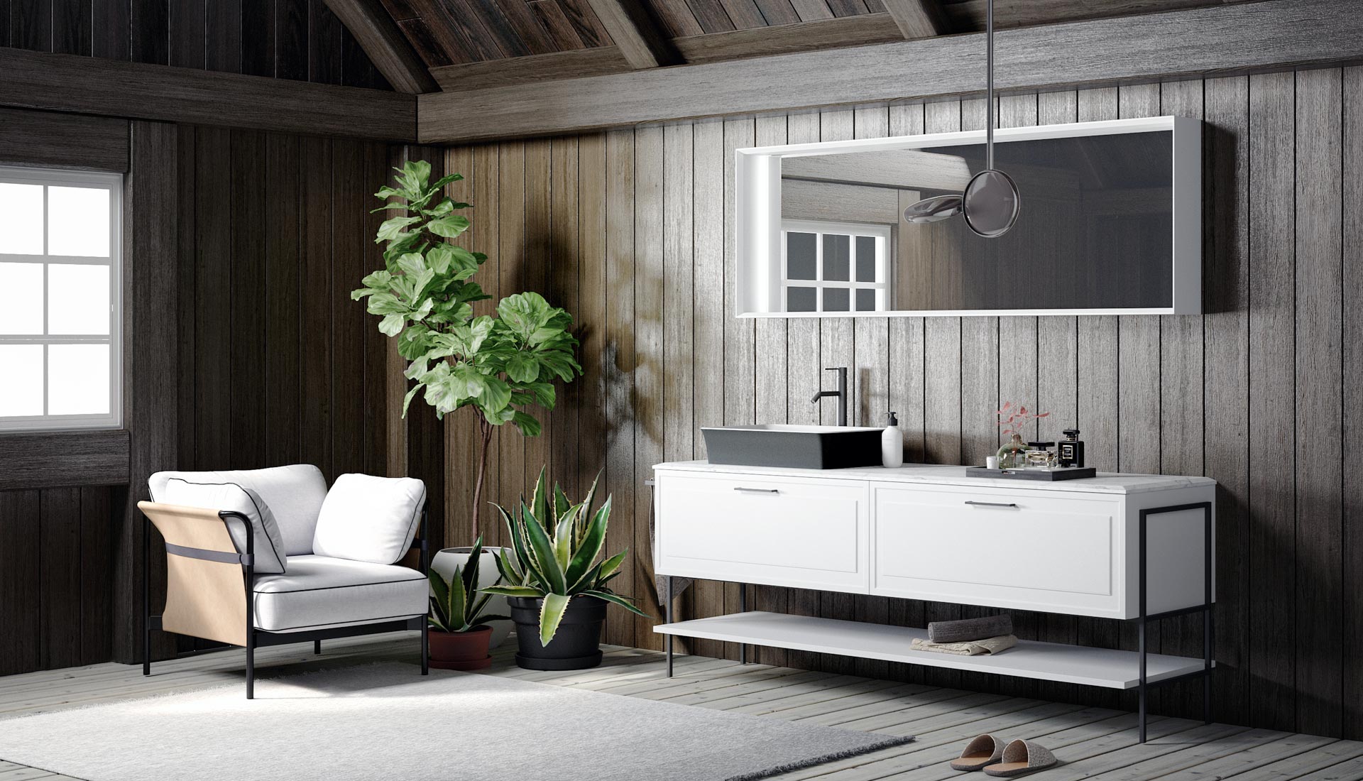 In a warm and welcoming atmosphere, the presence of wood highlights the neoclassical purity of white. The external washbasin surface , combined with the Structura element, harmonizes with the veins of Carrara marble.
