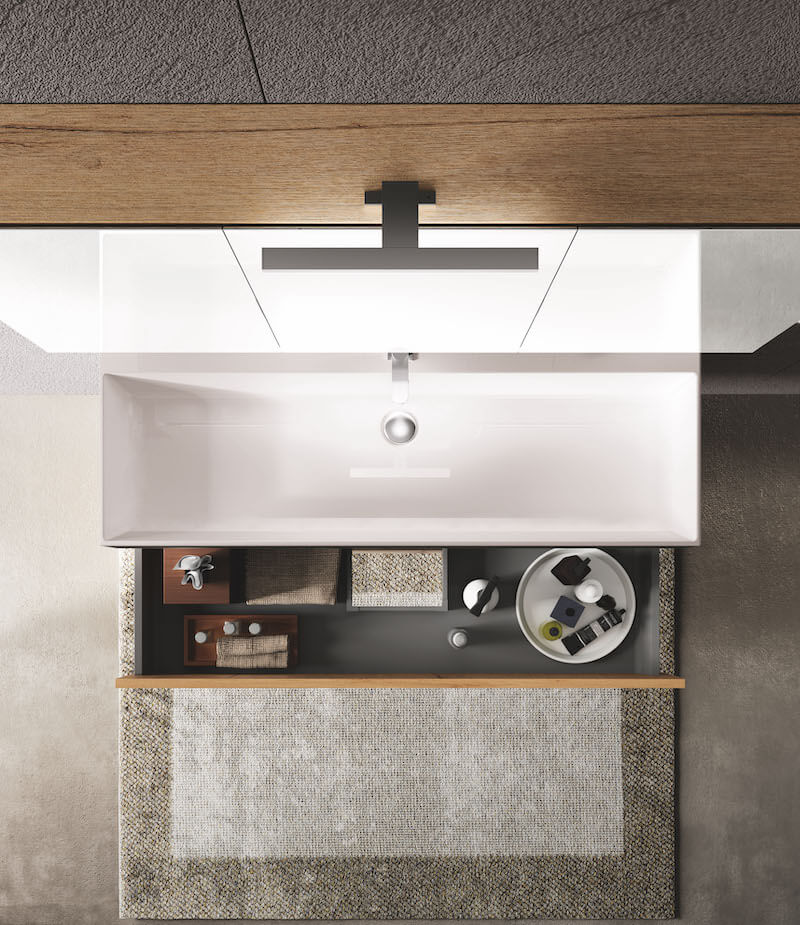 A composition where the search for storage space is pushed to the maximum, relying on the presence of the mirror container, with double surface mirror doors. The clean lines of the SLIM ceramic console are truly amazing, it also counts on a full width basin.In this detail we appreciate how much the single throat gives elegance to the whole. The container mirror, in addition to offering practical additional space, has doors with double surface mirroring, to be used as a triptych.