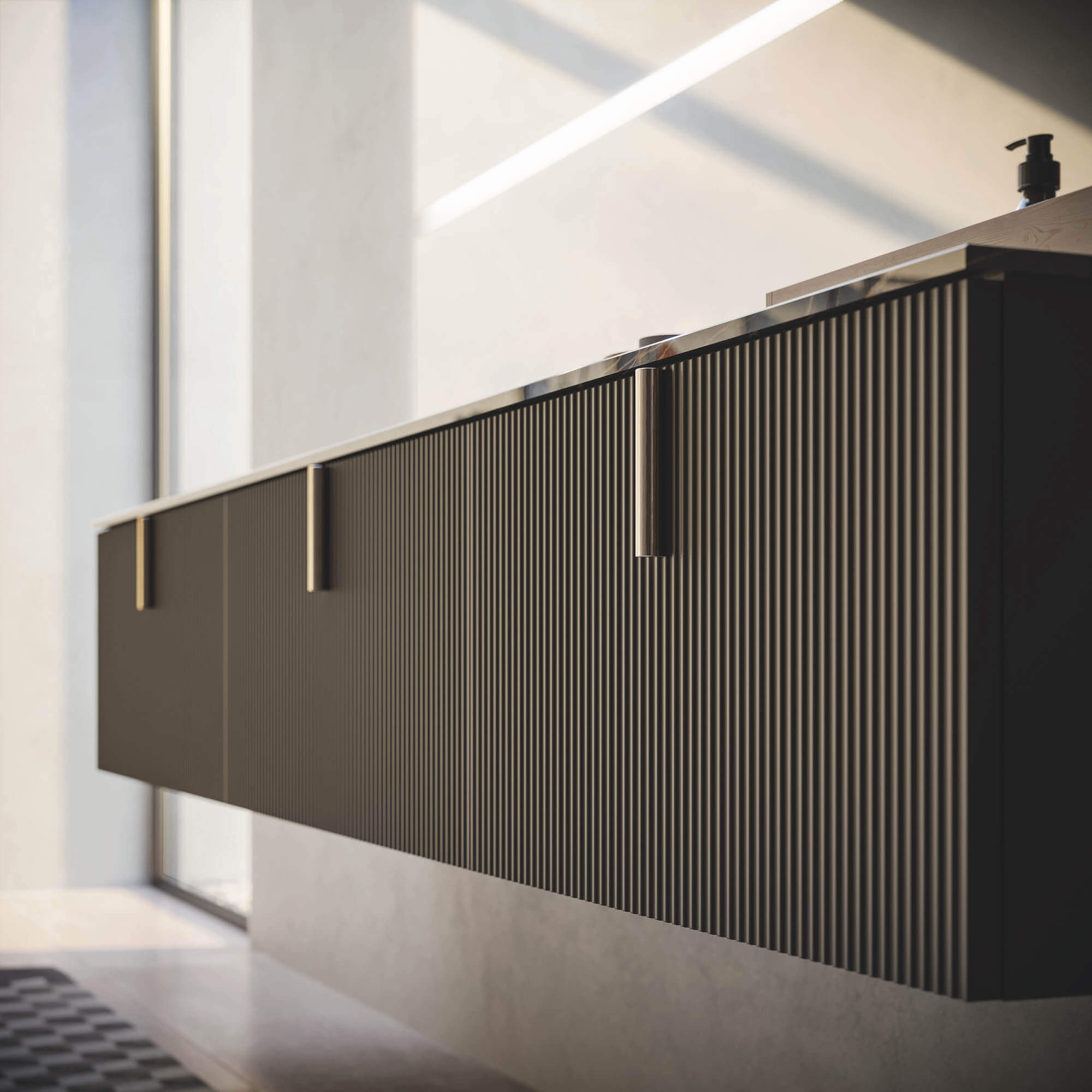 Precious and welcoming, but at the same time rigorous and rational, with an exciting play of light between the LUX4 mirrors and the wall unit. Unleash your creativity. Dark but warm, embellished with ART brass handles, the VERTIGO front effectively matches the finish of the stoneware top. A precious play of warm and exclusive shades, between top, cabinet and mixer.