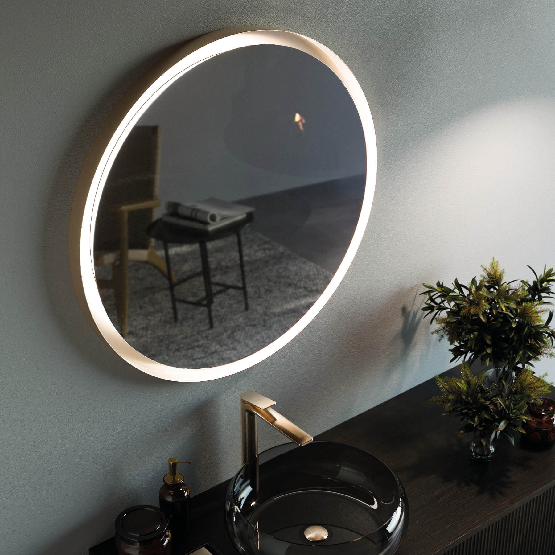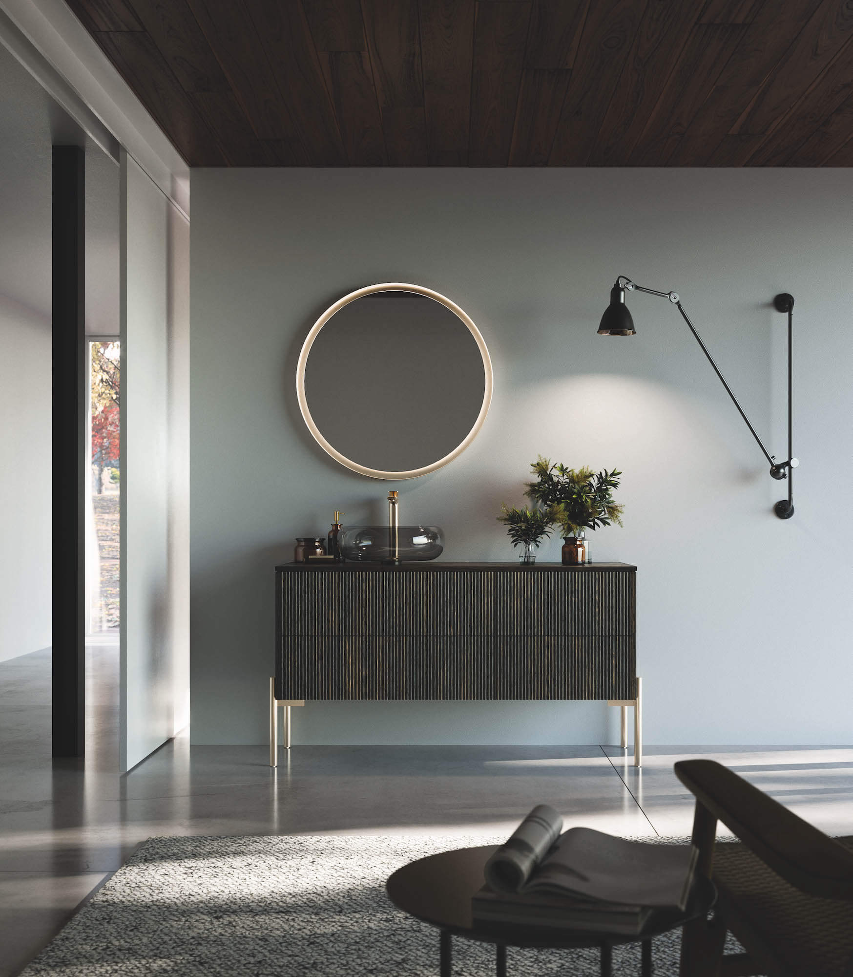 Compact but with a bursting image. In a dream environment, this composition, thanks to the push-pull opening of the fronts, keeps a rich piece of furniture essential. A rich but minimalist design foot that fits into the curves of VERTIGO, here combined with optional finishing sides. The SOLE mirror is full of charm, made in matt white as standard, and is available in optional brass and oxidized finishes.