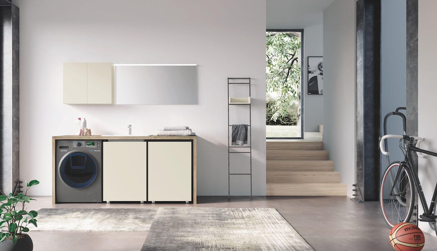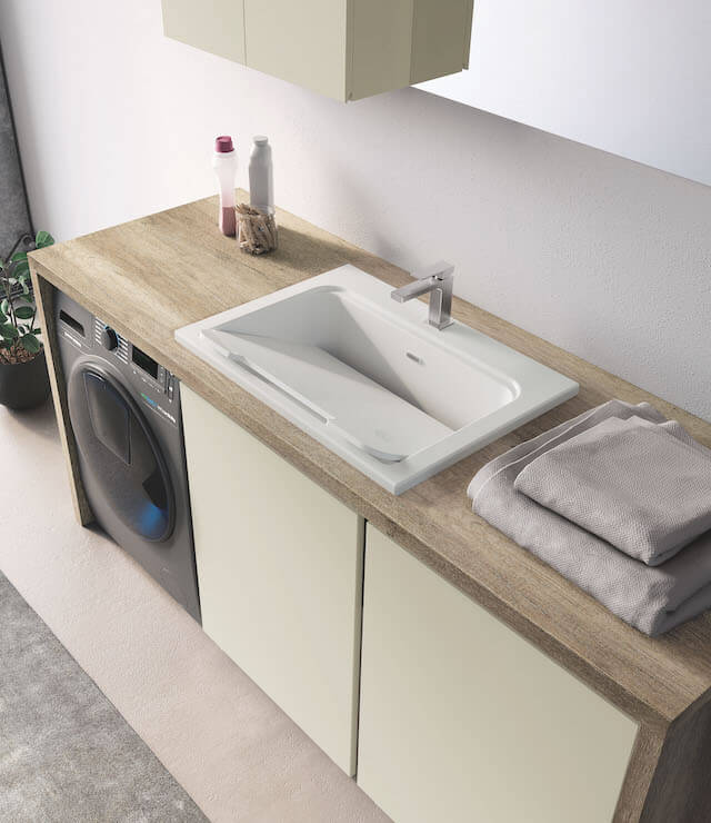 In this composition that makes functionality its strong point, a large worktop integrates a large ceramic sink, composes a structure that encloses washing machine and practical pull-out trolleys for linen and ready to use objects. In detail, you can see the large ceramic bathtub with the practical wash-tub axis in the position of use, made of gelcooked material (Ocritech White Glossy).