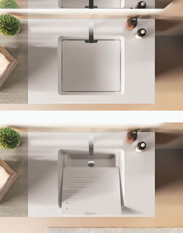 An important composition that solves the entire laundry space, presenting capable containers and housing for appliances. Interesting is the open compartment next to the washing machine, where you can place detergents and anything else useful for its use.