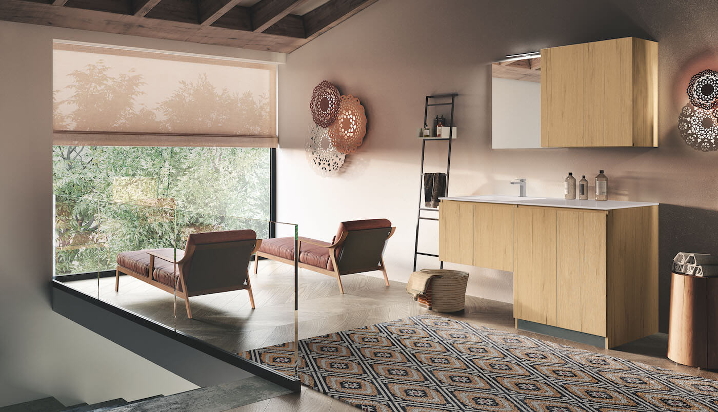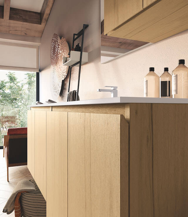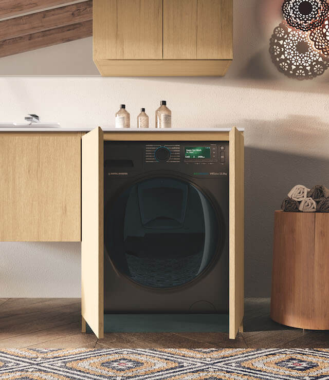 The one illustrated here can be defined as the typical composition for the laundry, in a small space, there is a washing machine and a large wash-house. The entire composition, in a position of non-use, assumes the aesthetics of a modern bathroom cabinet. A very topical and much requested finish dresses this composition that maintains the volumes and aesthetics of a typical bathroom cabinet.