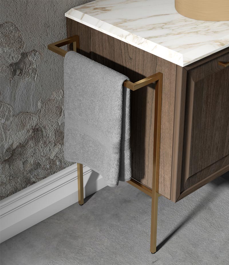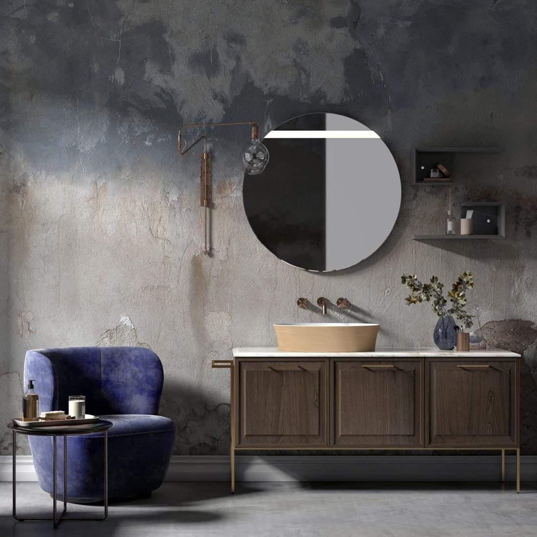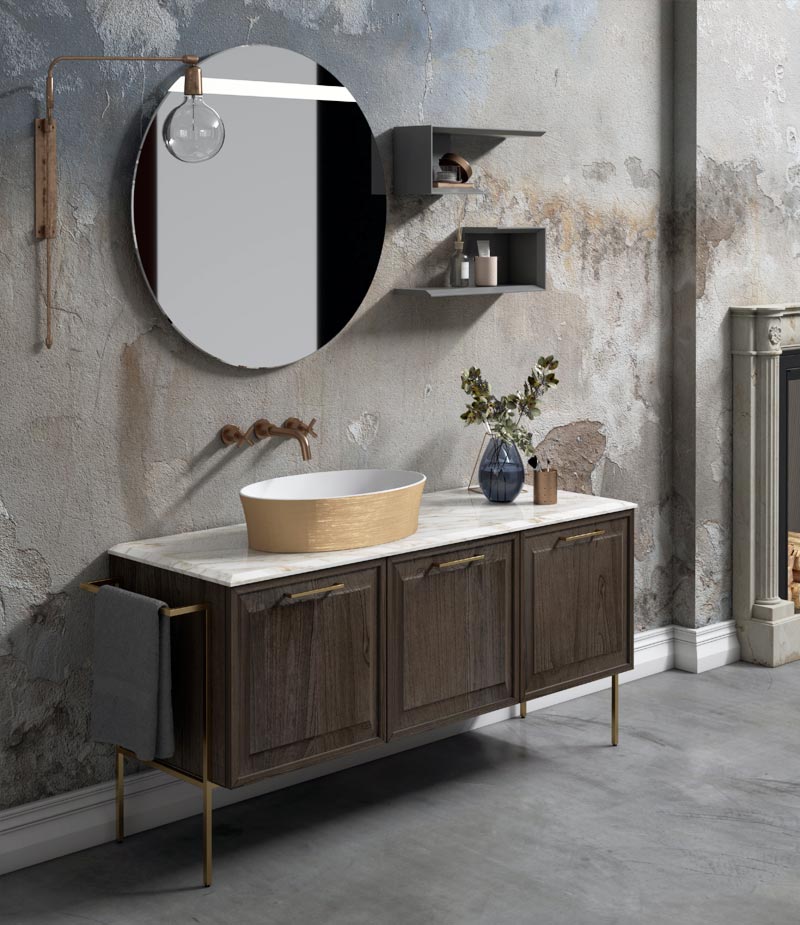 In an atmosphere with strong industrial accents, the matericl surfaces harmonize with the precious finishes of Structura and the coordinated washbasin.