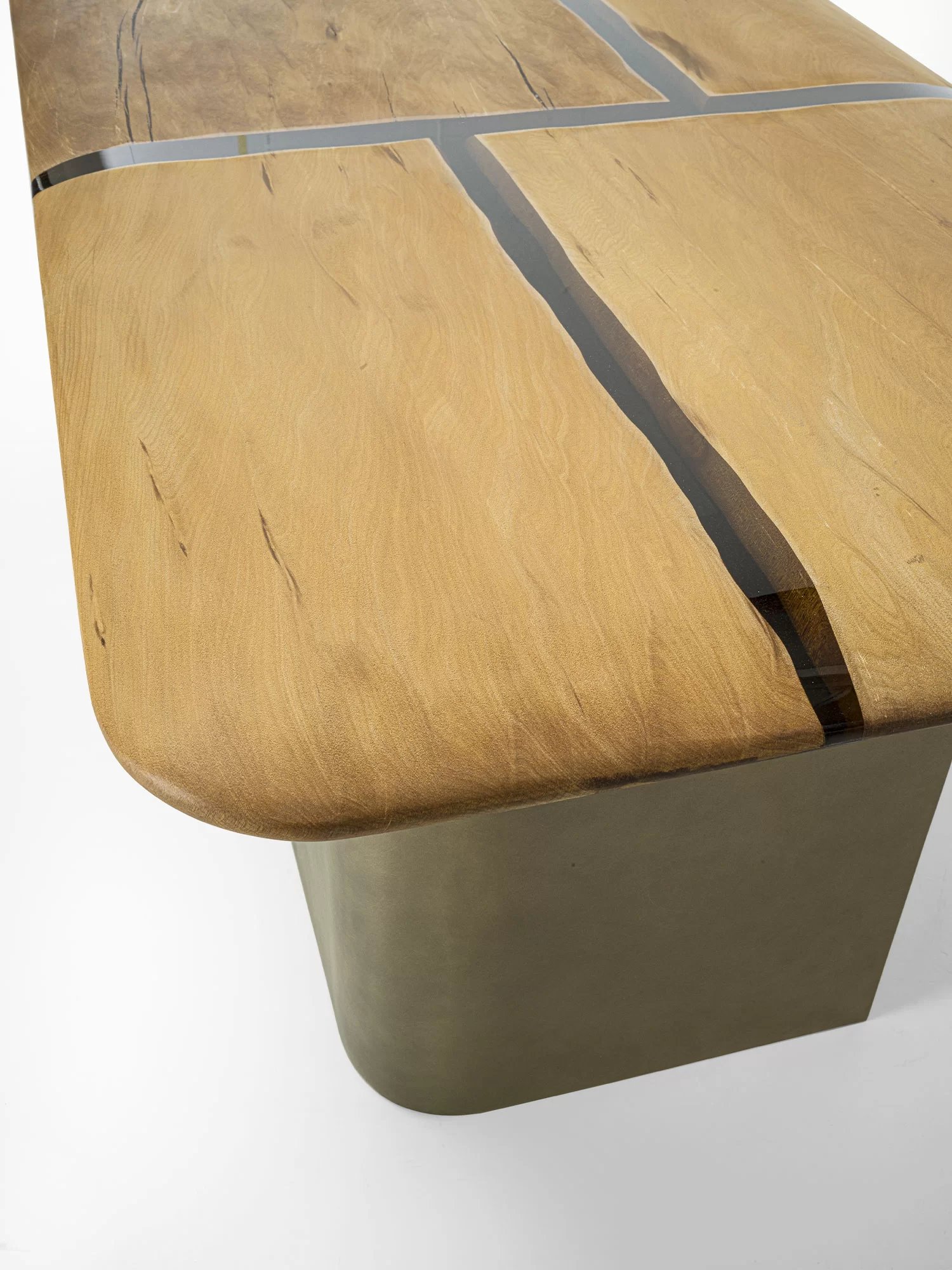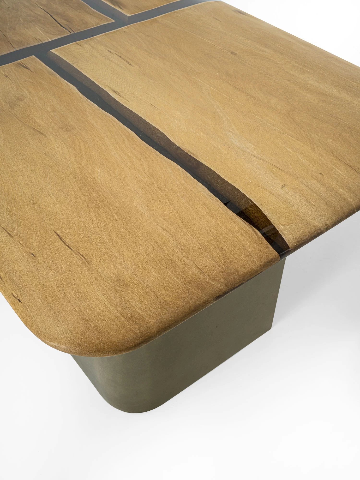 Tavolini il cui top nasce dall’accostamento di parti in legno di Kauri con inserti in resina, che insieme creano geometrie dinamiche e raffinate, abbinato ad una base in ferro, disponibile in due altezze. Gli spessori assottigliati tramite lavorazione a saponetta del top donano leggerezza e sinuosità.