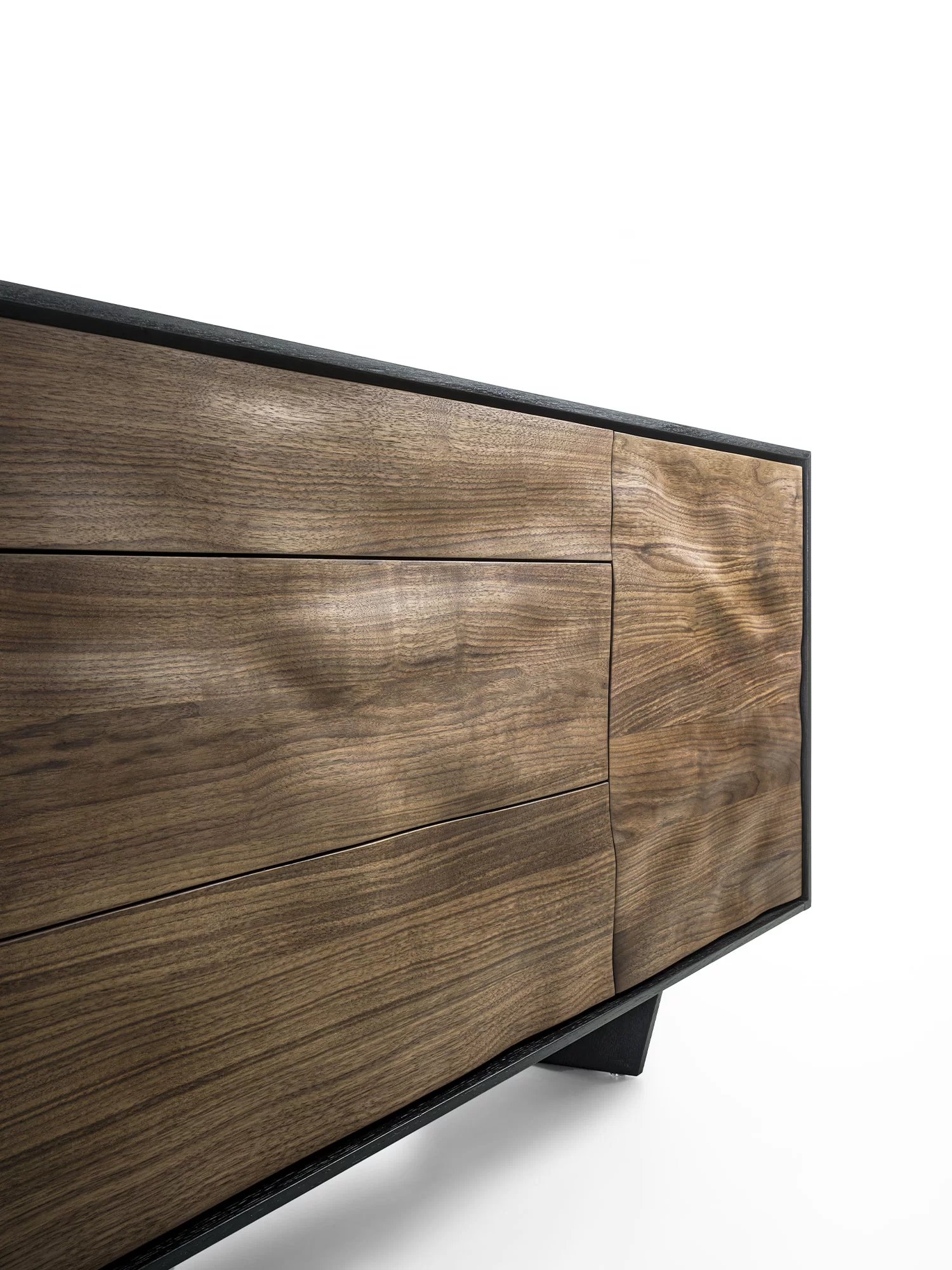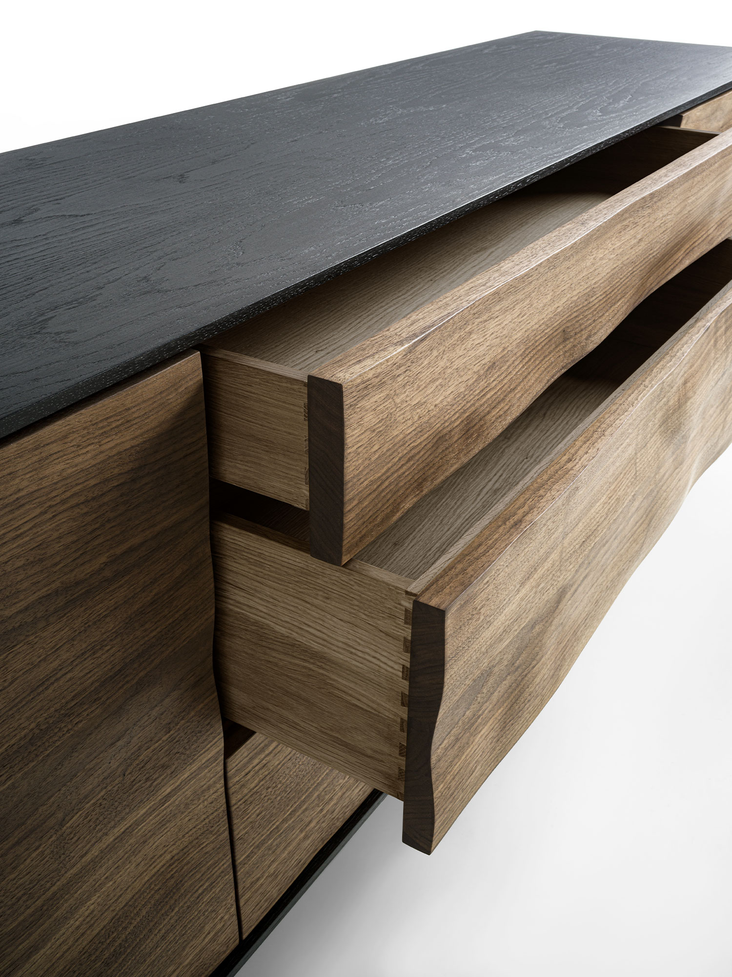 Credenza in legno massello e listellare, racchiusa da cornice in legno. La particolare lavorazione su ante e frontali dei cassetti crea un effetto scultoreo attraverso l’estroflessione del legno, donandole un movimento sinuoso.