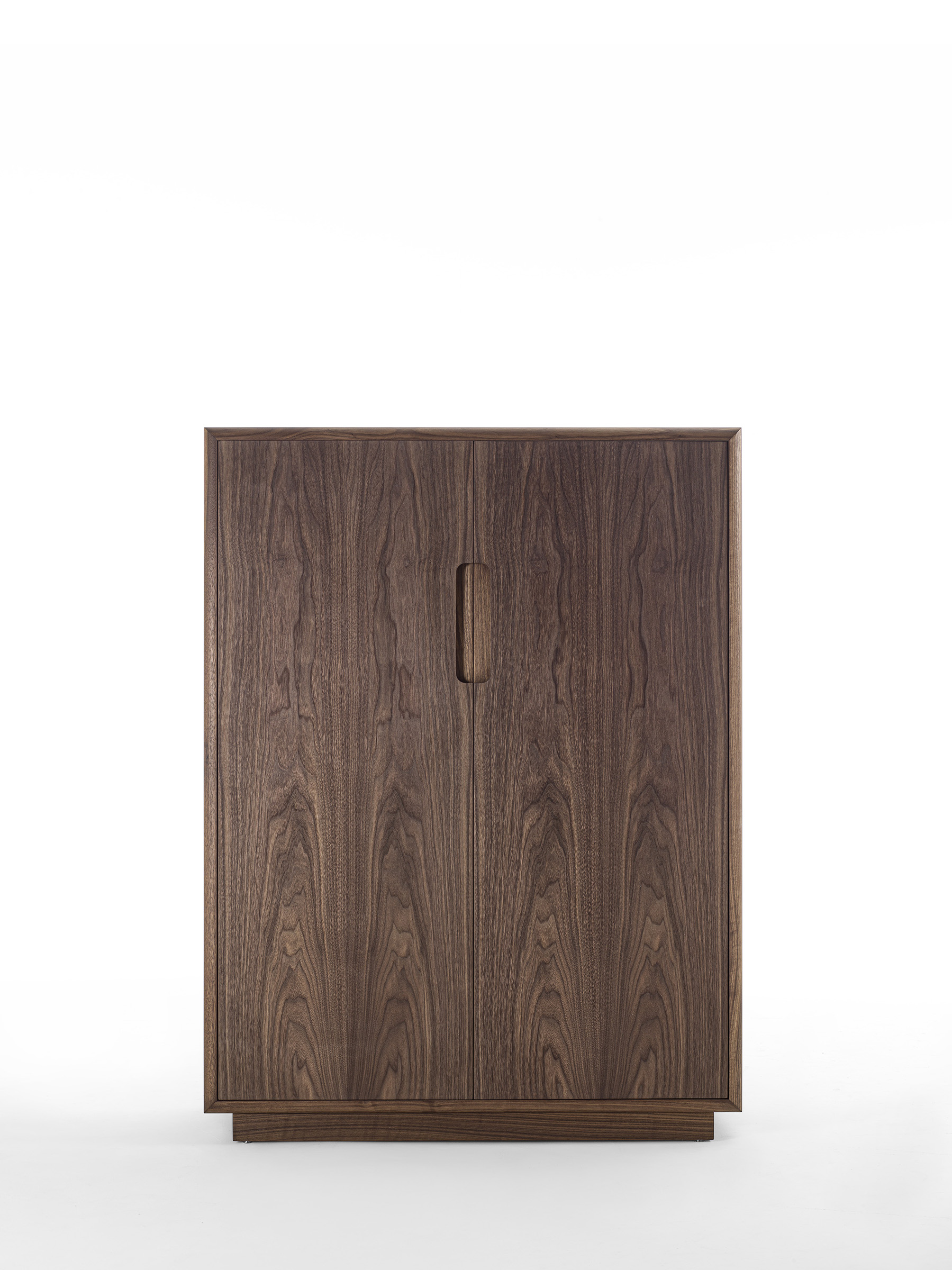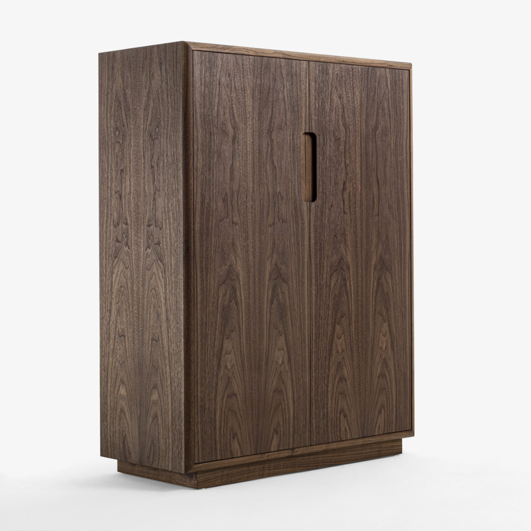 Credenza alta in legno massello e listellare. Munita di due ante a battente con maniglia incassata e sagomata, che racchiudono all’interno due ripiani e tre cassetti assemblati con incastri a coda di rondine. Struttura con bordi stondati.