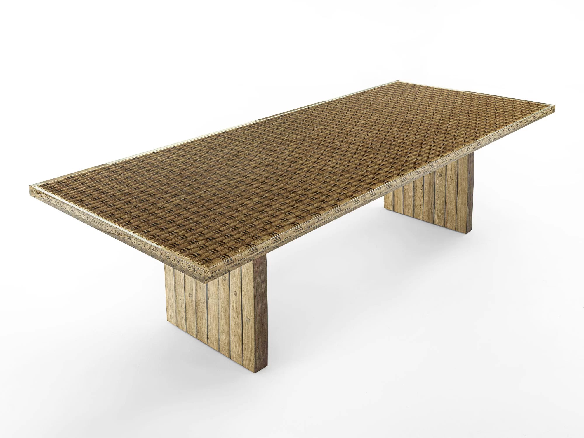 Tavolo con basamento in rovere proveniente dalle Barrique e top realizzato con tappi di bottiglia in sughero immersi nella resina.