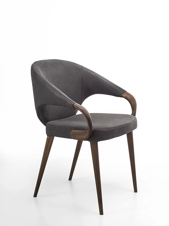 Poltroncina elegante ed avvolgente, con gambe e braccioli in legno massello. Seduta e schienale rivesti in pelle o tessuto.