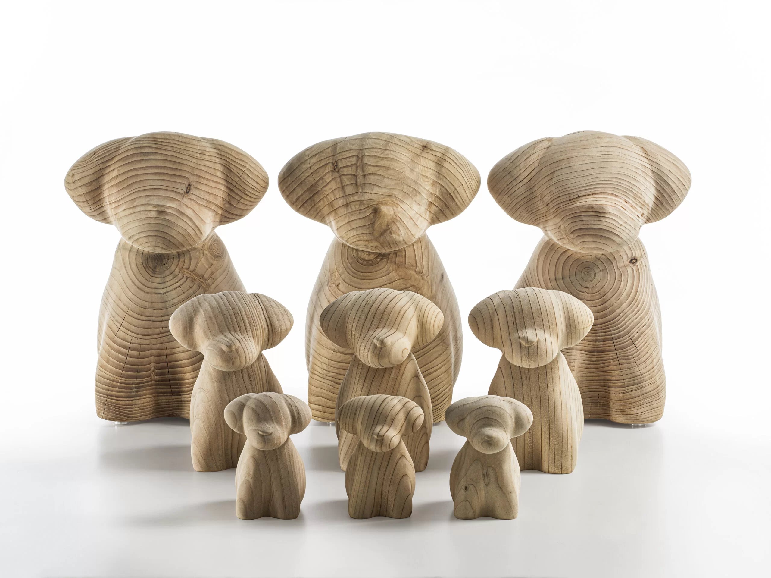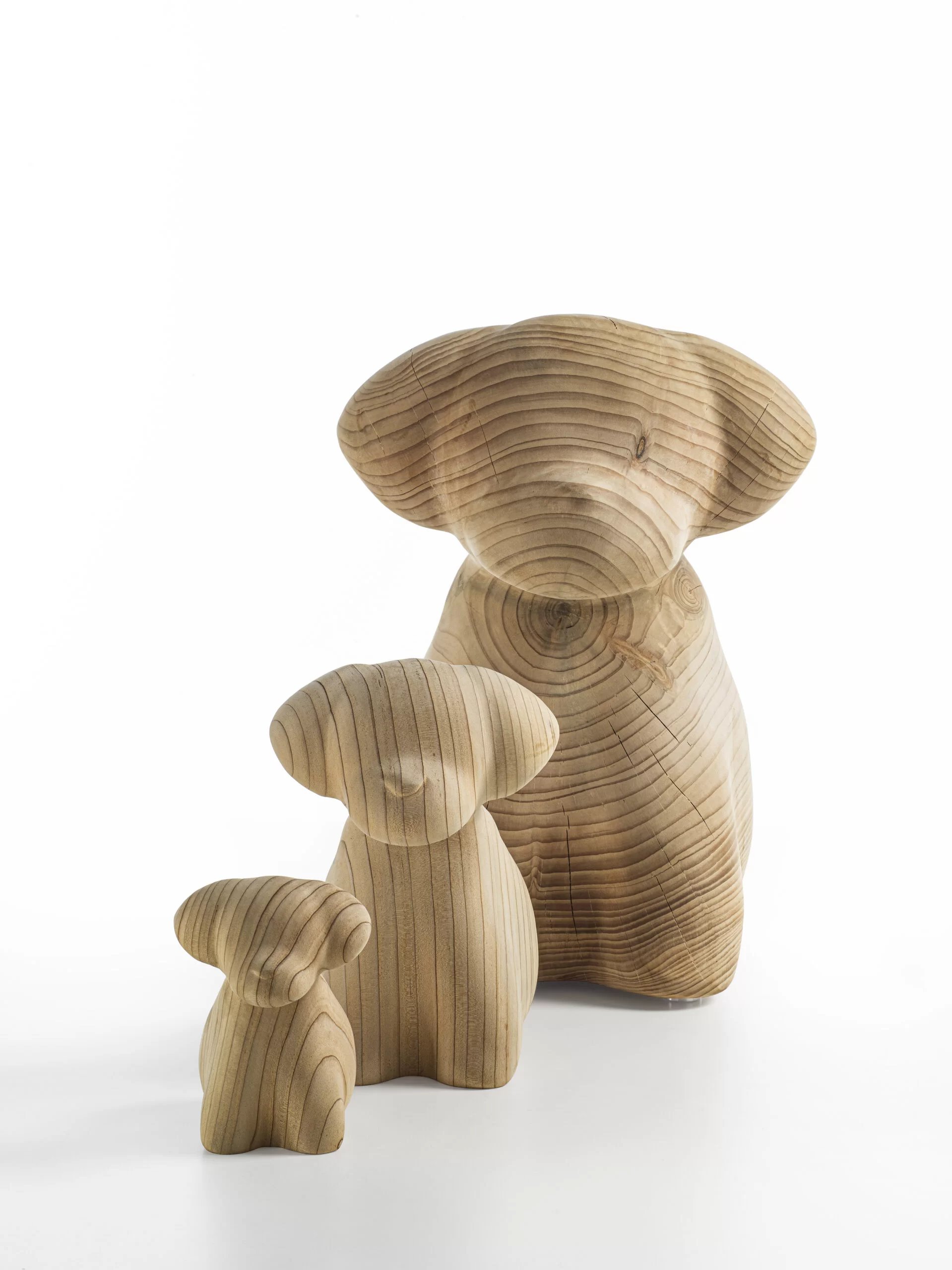 Complemento d’arredo in legno massello di cedro profumato lavorato da un blocco unico, il cui design scultoreo si ispira ad un cane di razza maltese.