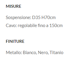 Sostenuta da un cavo elettrico rinforzato regolabile in altezza grazie al rosone abbinato, la lampada Lift può essere utilizzata singolarmente oppure in gruppi per uno scenografico effetto.? Lift si caratterizza per le sue linee essenziali e sinuose che si adattano con eleganza ad ogni tipo di ambientazione, sia casa che contract.