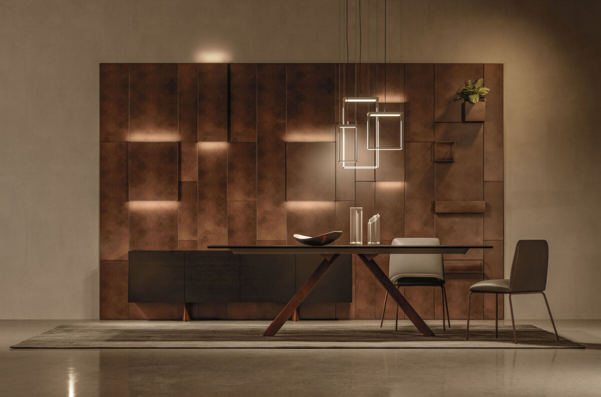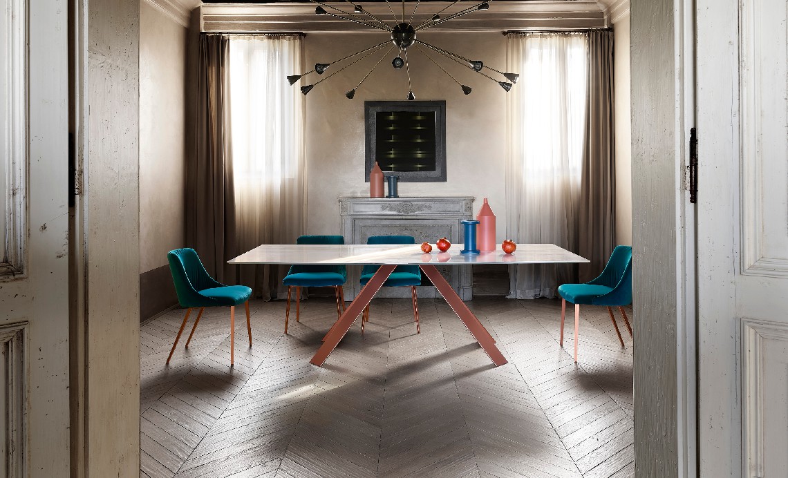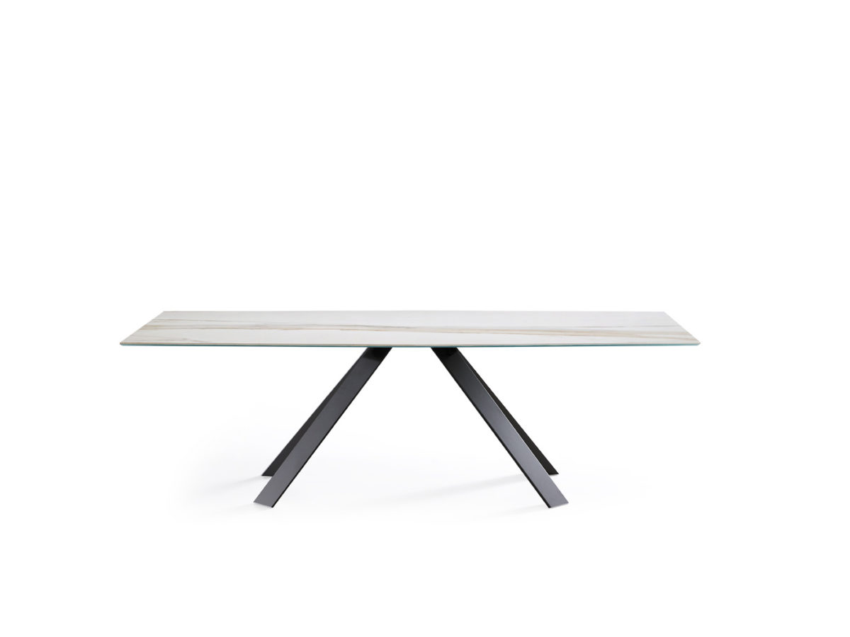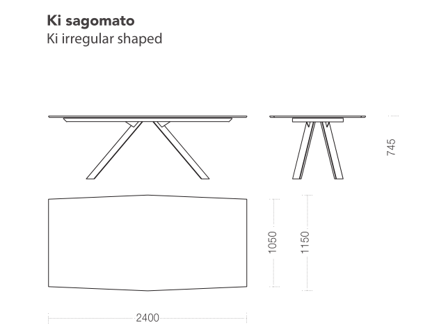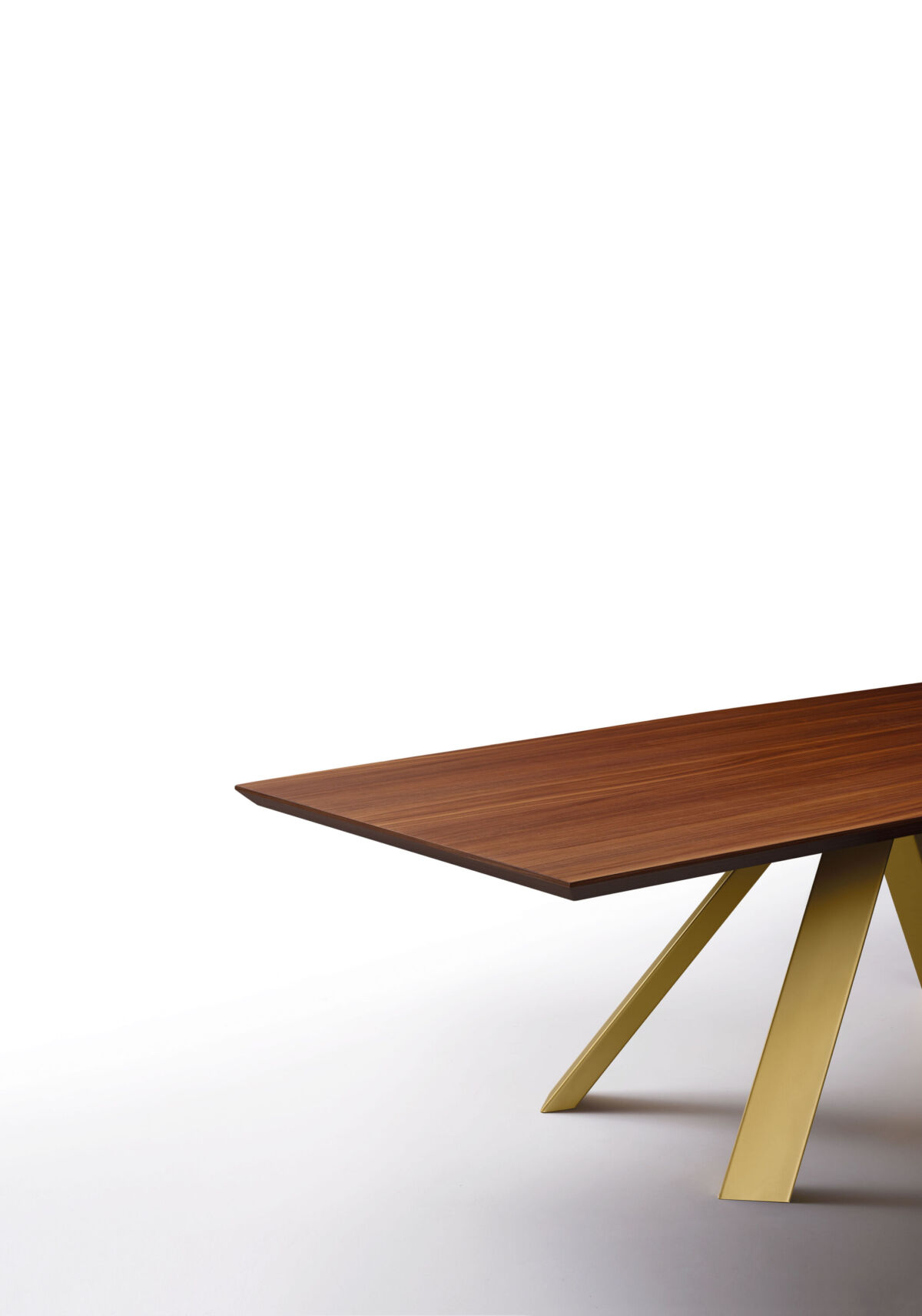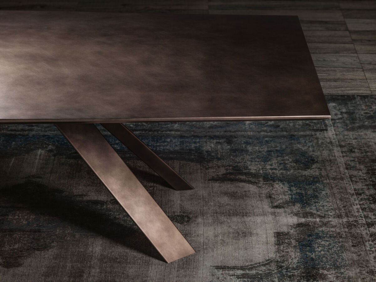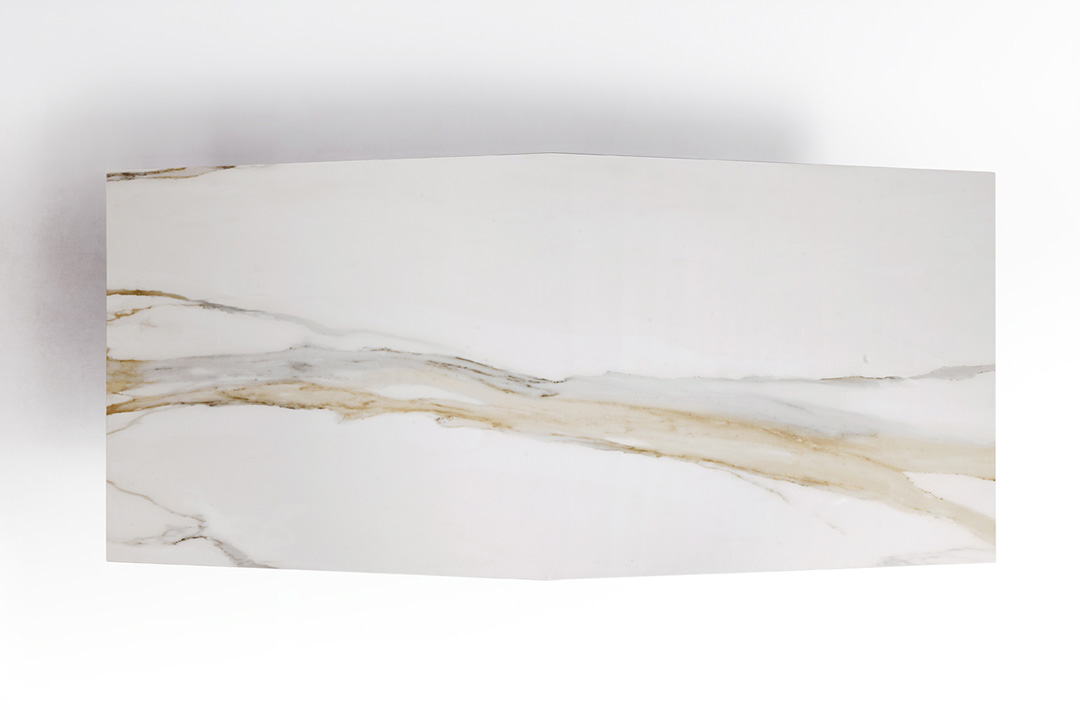 Table with painted metal base and top with elongated hexagonal or rectangular shape available in different finishes.
