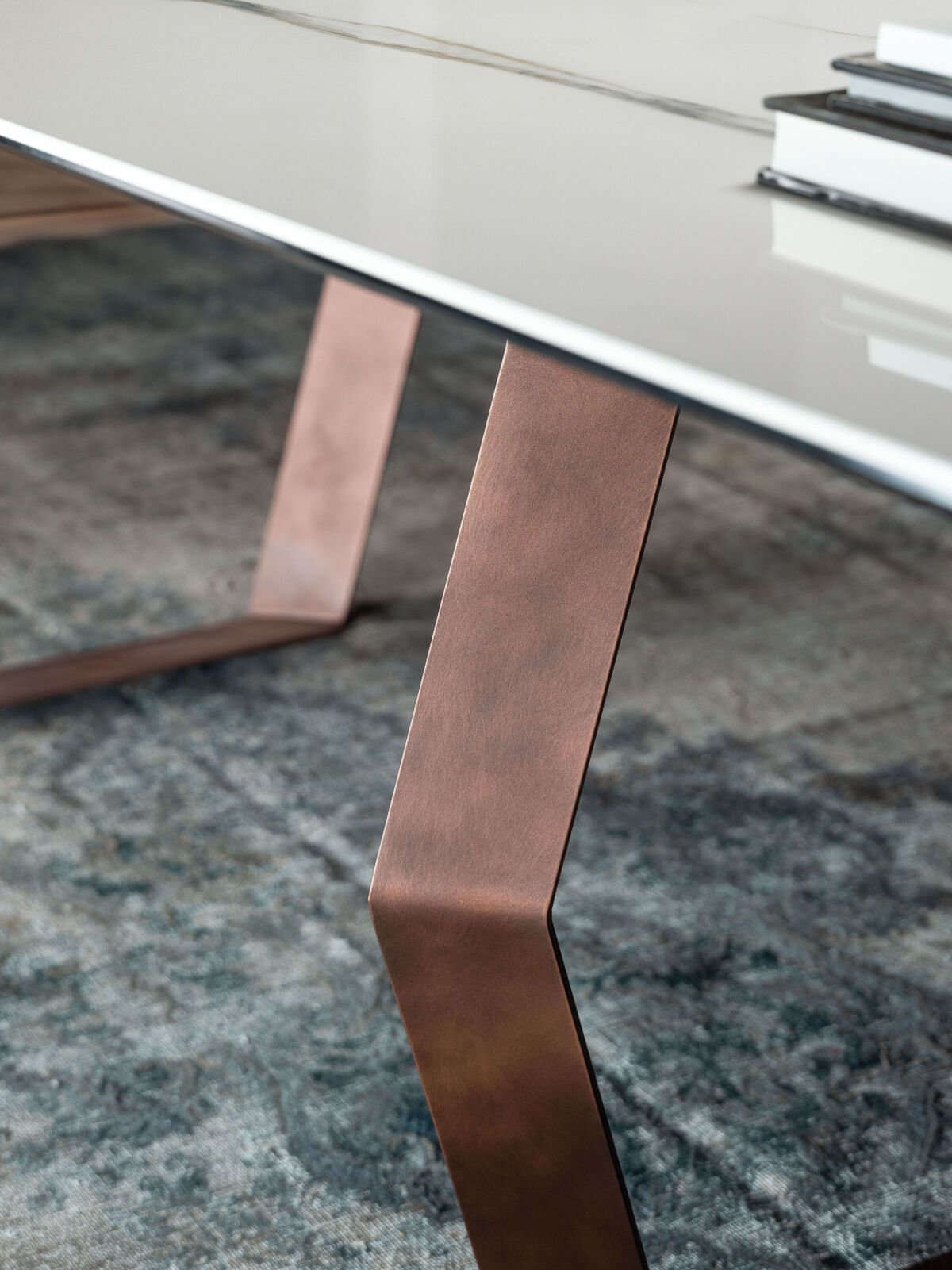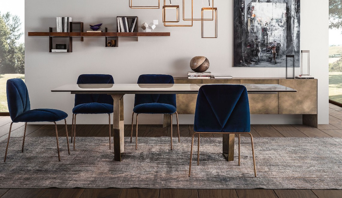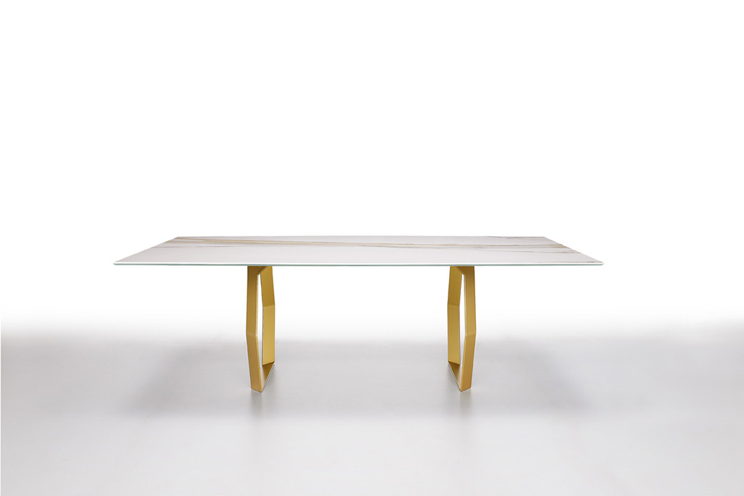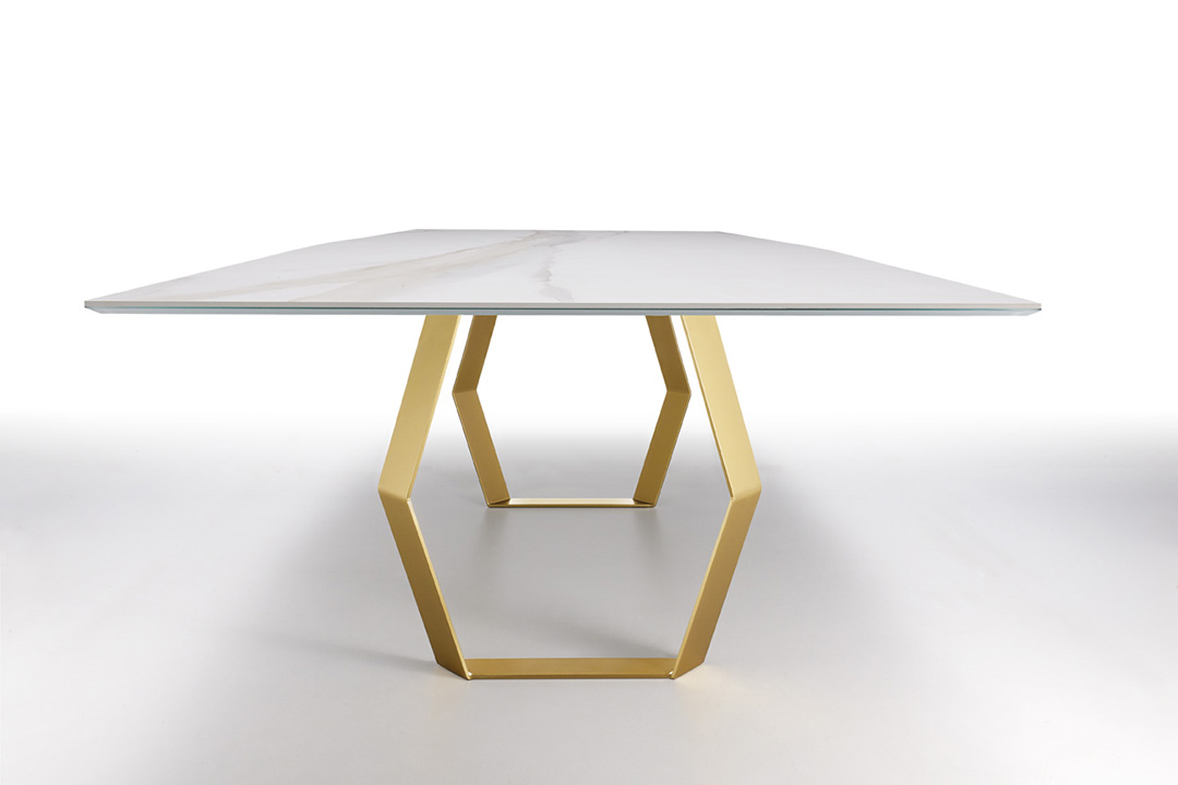 Mexa is a table with hexagonal shaped supports. The metal base is available in different finishes. Top is in ceramic, glass or wood and in