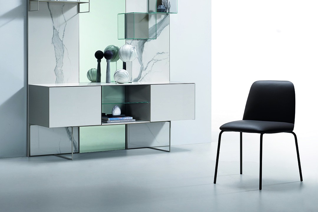 Mantra è una collezione di sedie disponibile in due versioni: con imbottitura liscia o lavorata a triangoli. La seduta è disponibile in pelle, velluto o ecopelle.