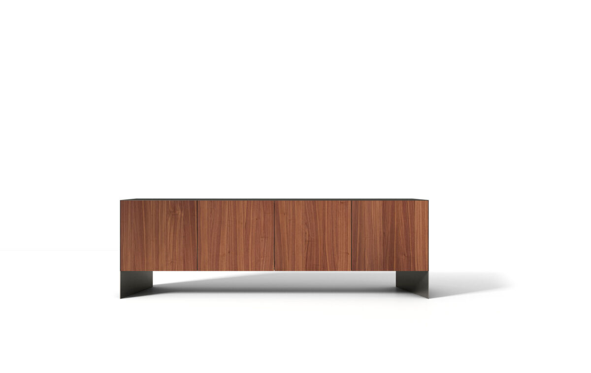 Sideboard with metal structure and doors available in wood, ceramics or metal. Black lacquered inner compartment with glass shelves.