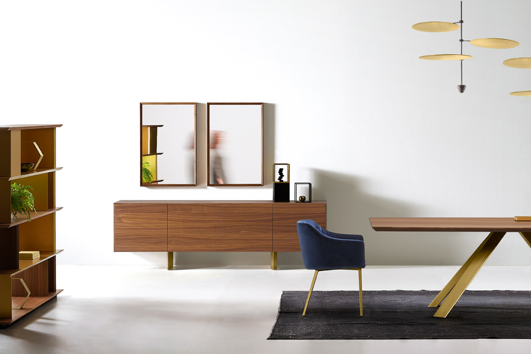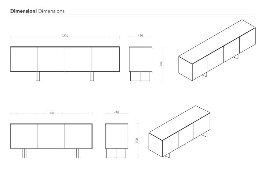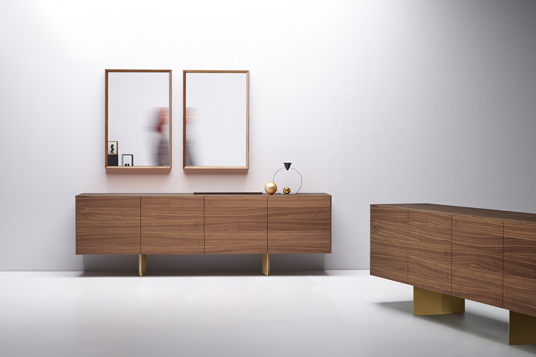 Sideboard with four or three doors made in wood, diamond shaped feet in painted metal.