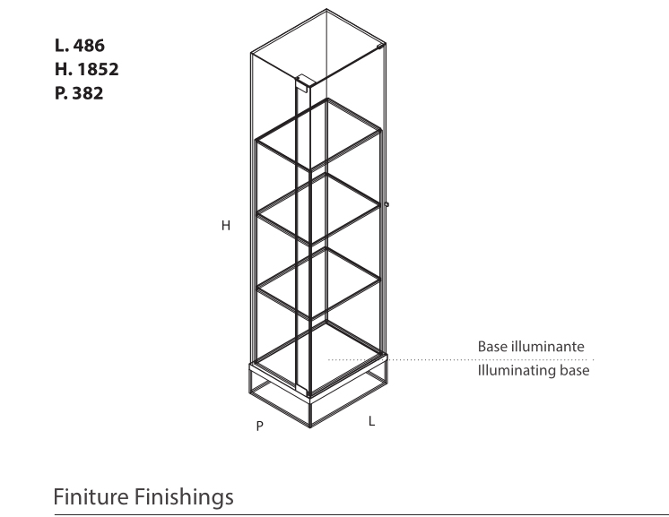 Prima è una vetrina in cristallo extrachiaro, con una struttura interna in metallo a sezione quadrata e un’anta a cerniera laterale.