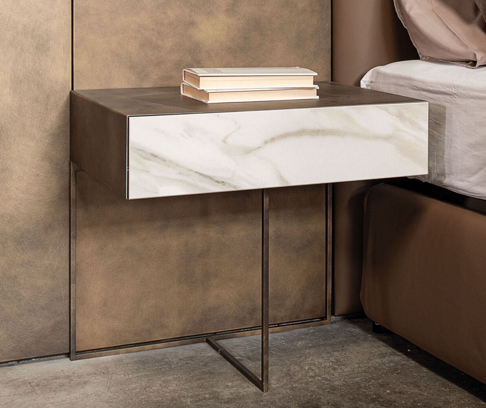 Comodino in metallo e ceramica sostenuto da un telaio sottile e dotato di un pratico cassettino con frontale in ceramica effetto marmo oppure in metallo.