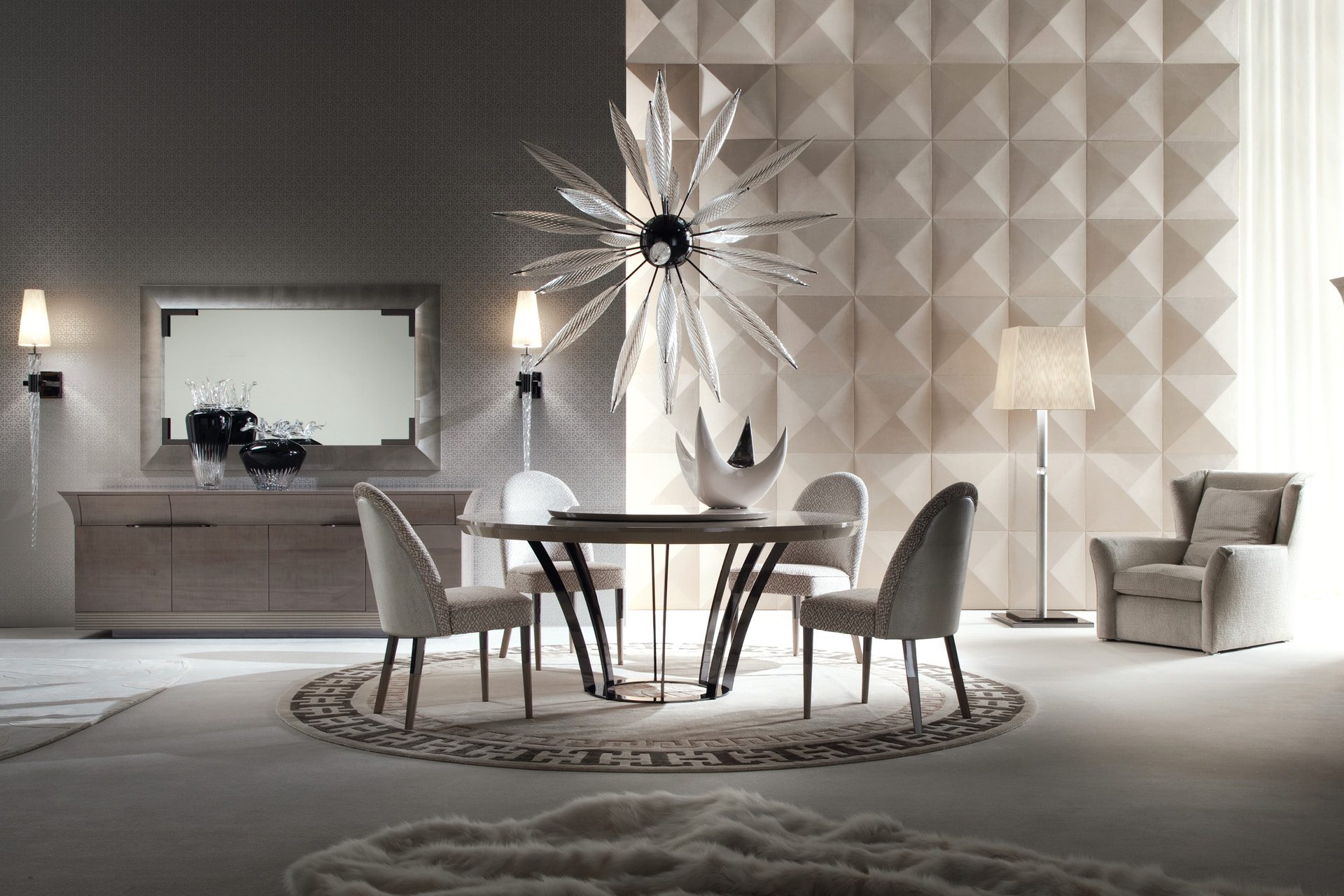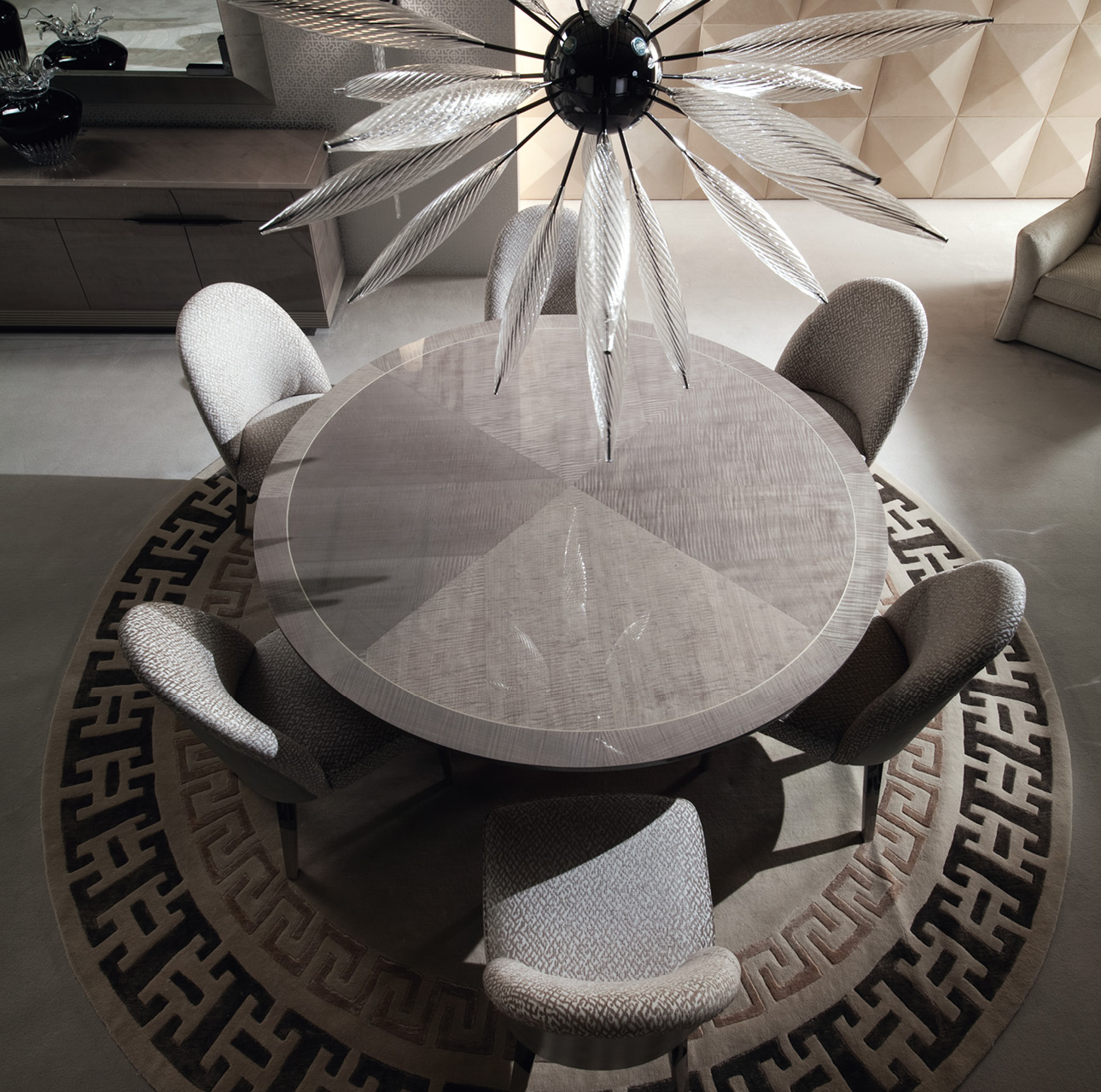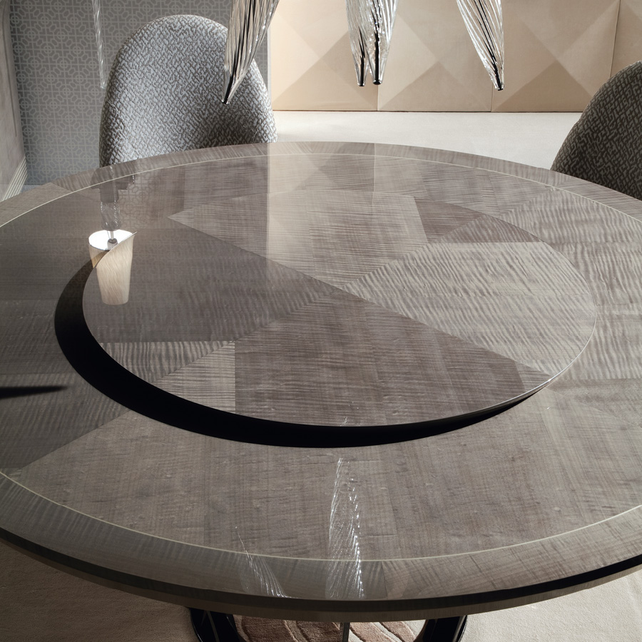 Round table in tiger African sycomore veneer with high gloss polyester finish. Fixed top with base in stainless steel in storm dark grey finish. White maple fine line inlay in the top.