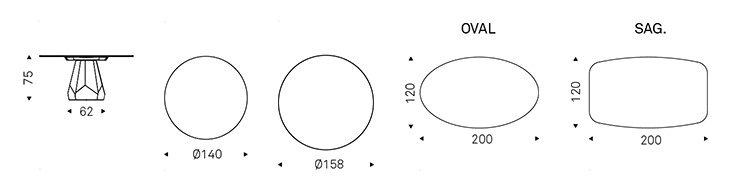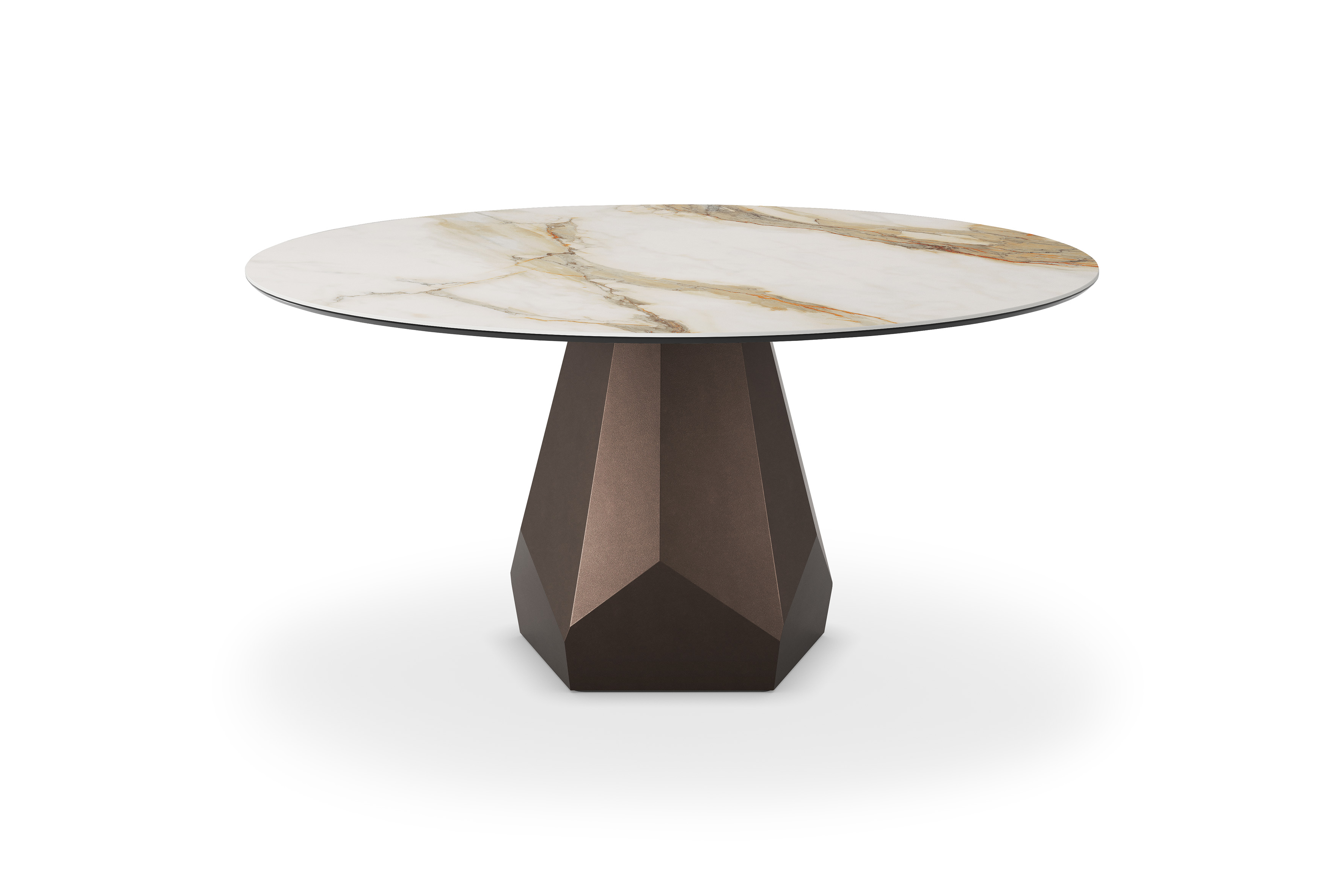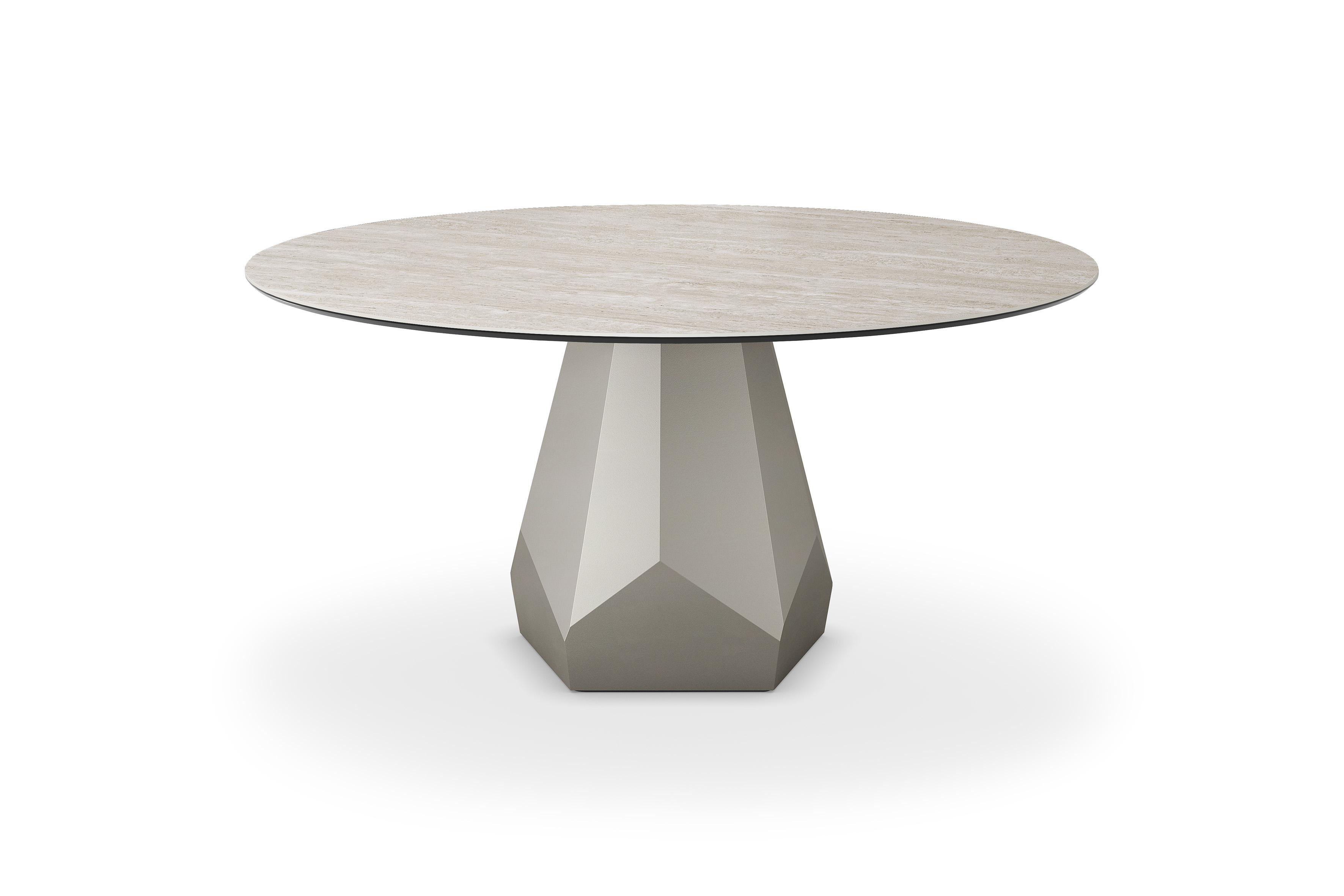 The Zermatt family of tables features a central base packed with corners and verticals. More precisely, it is formed of 15 sides that repeat around the central column with geometric precision. Each side of this prism appears to be a different colour, as light is reflected in varying intensity depending on the angle.