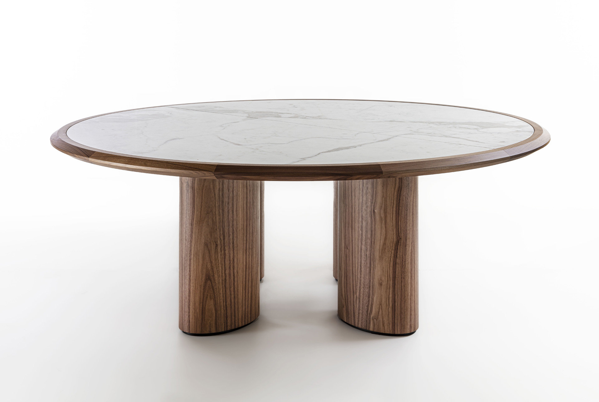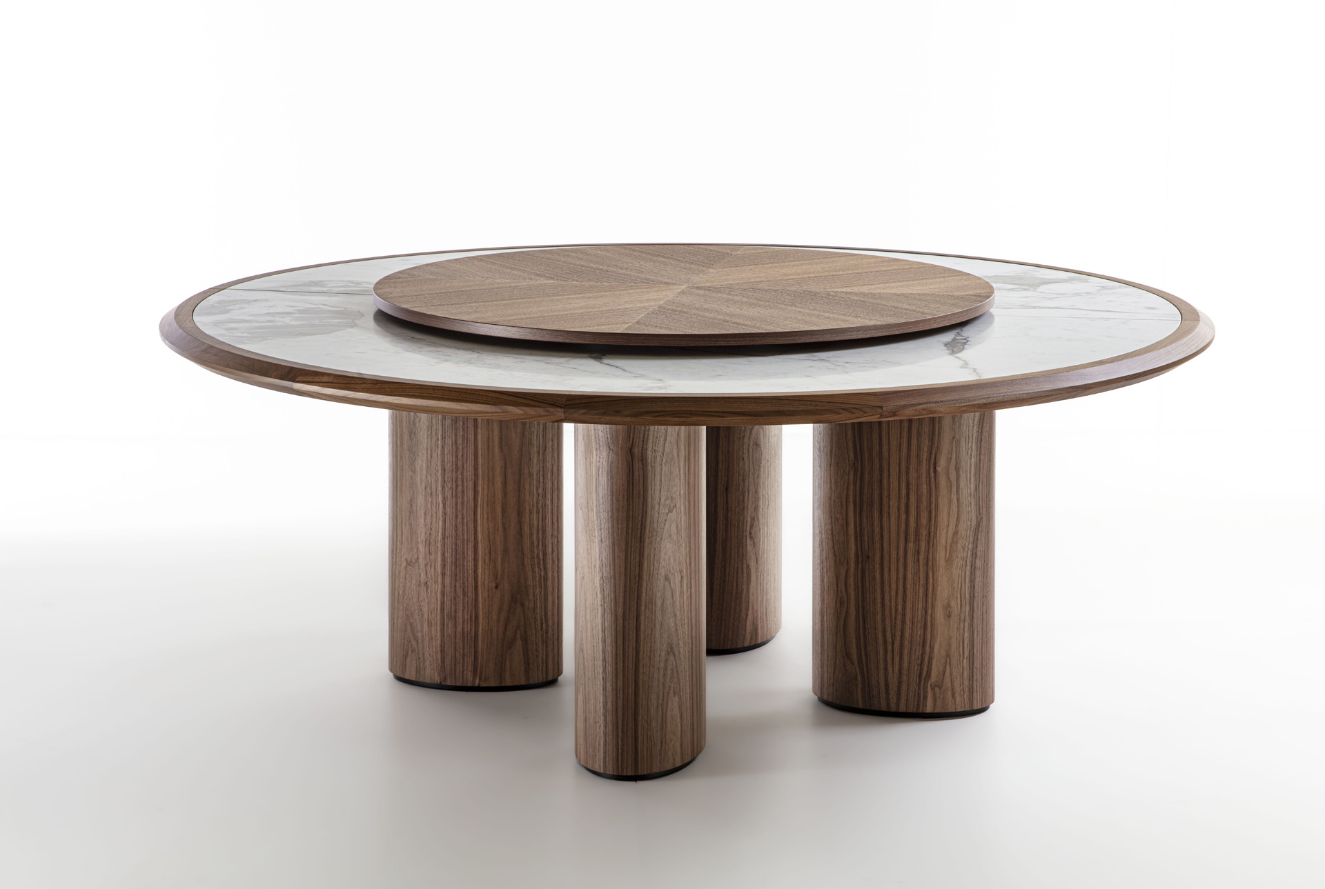 Round table with wooden structure and legs, with top characterized by a solid wood frame where the marble top is inserte.