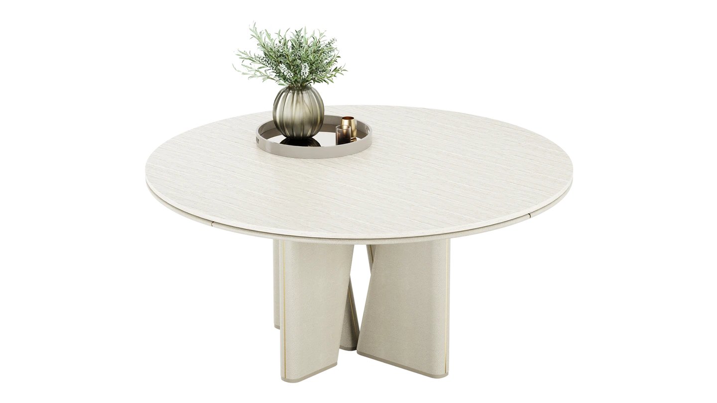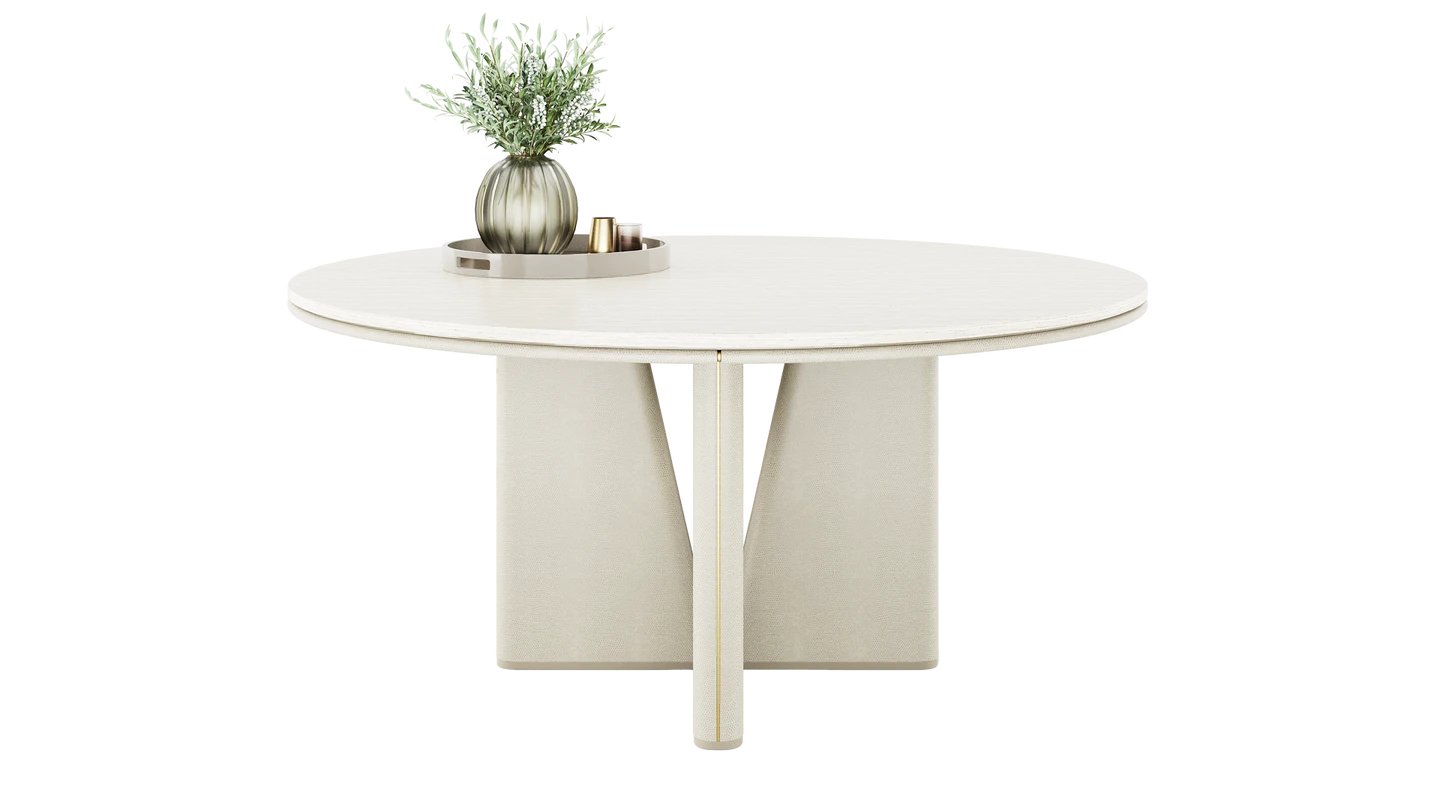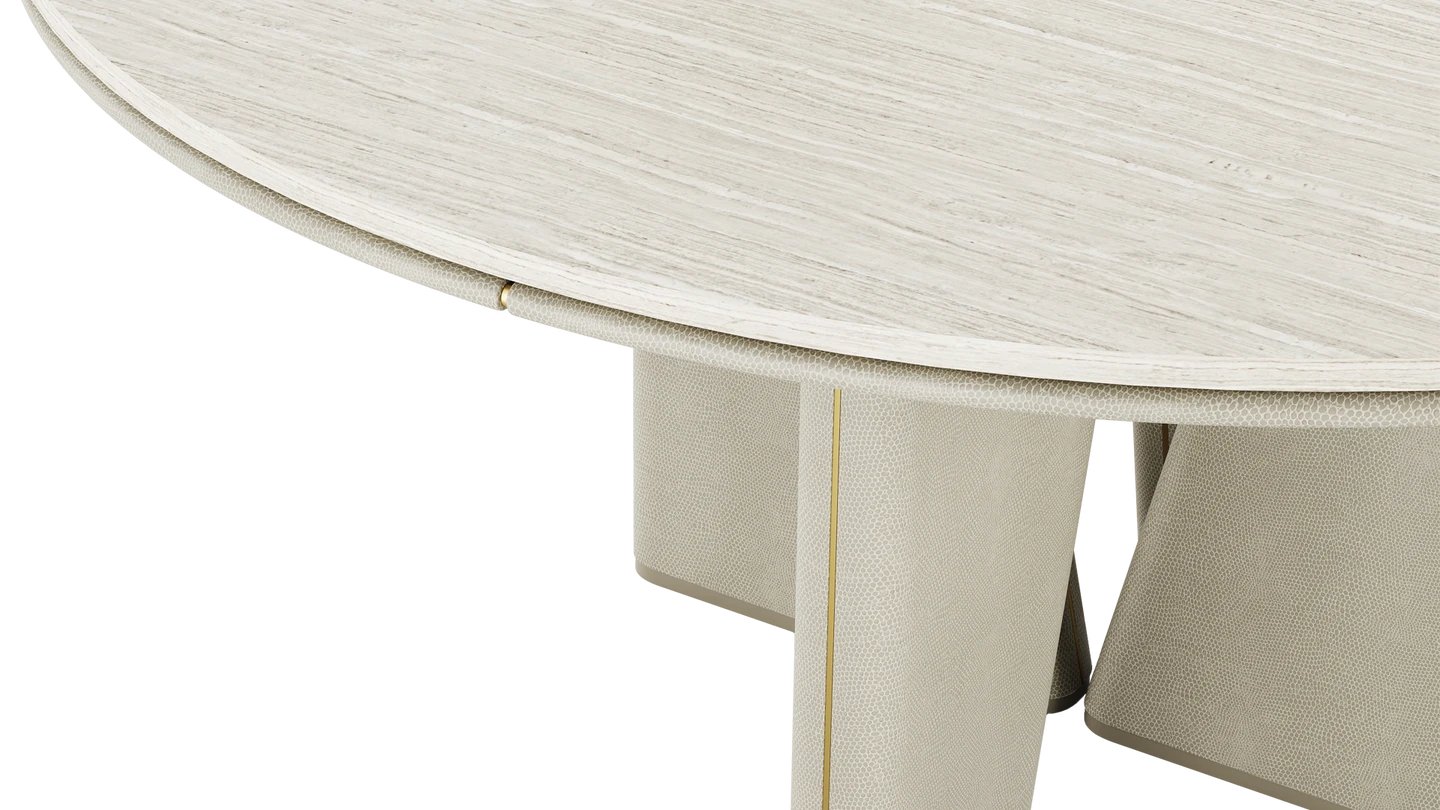 Our TORTONA Dining Table is a true masterpiece. A sleek stone top sits atop artistically sloped lacquered-wood legs, creating a commanding shape. It’s finished with leather and brushed brass detailing.