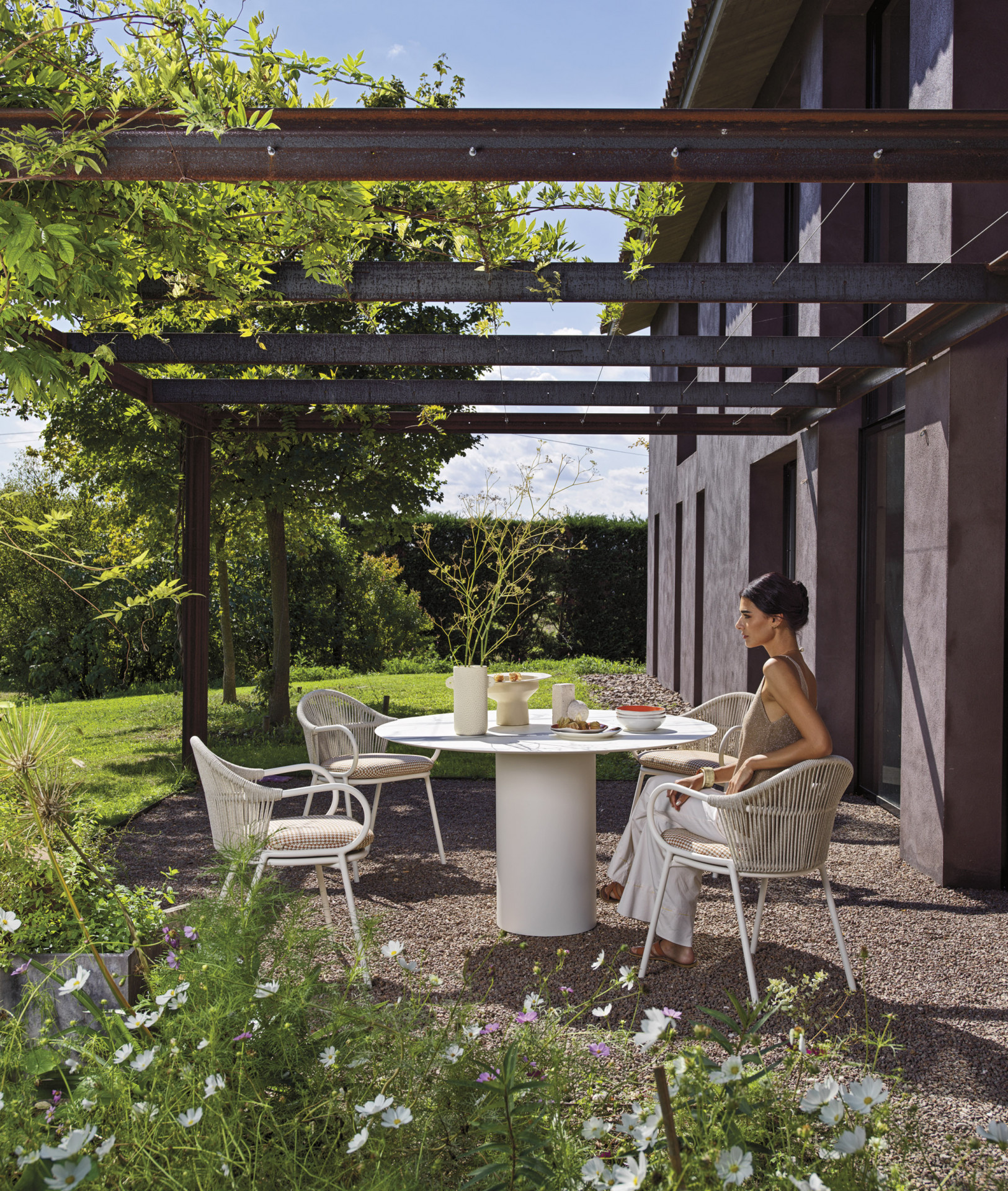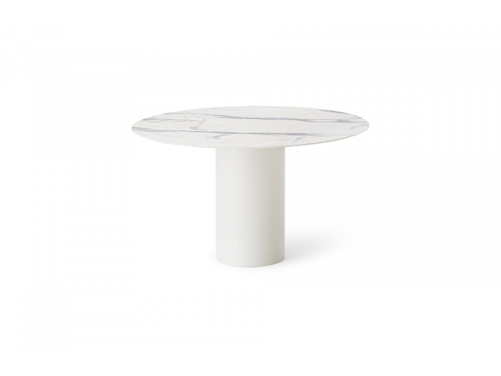 Tavolo rotondo con base in lamiera di acciaio inox Aisi 304 verniciato a polveri, top in HPL. Dal design minimalista e moderno, si caratterizza per il basamento cilindrico che rende questo tavolo il protagonista del vostro living, grazie alla forte espressione dei suoi materiali.