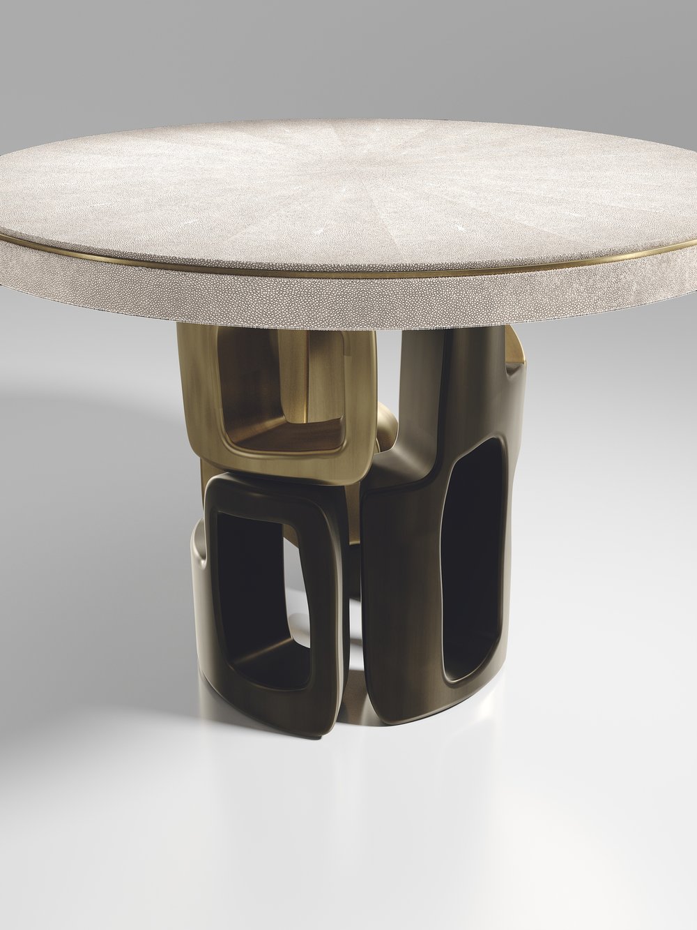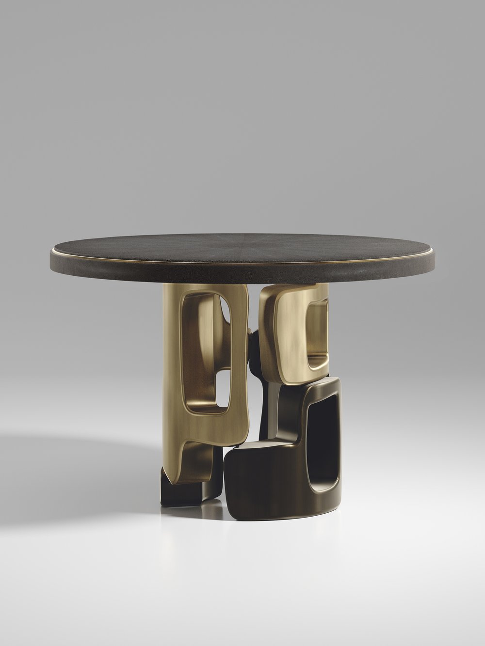 The Apoli Breakfast Table by Kifu Paris is both dramatic and organic its unique design. The tiger eye blue top sits on an ethereal geometric and sculptural bronze-patina brass base. The side band of the table is inlaid in black shagreen This piece is designed by Kifu Augousti the daughter of Ria and Yiouri Augousti. Part of the Apoli Capsule Series, see images of collection at end of slide.