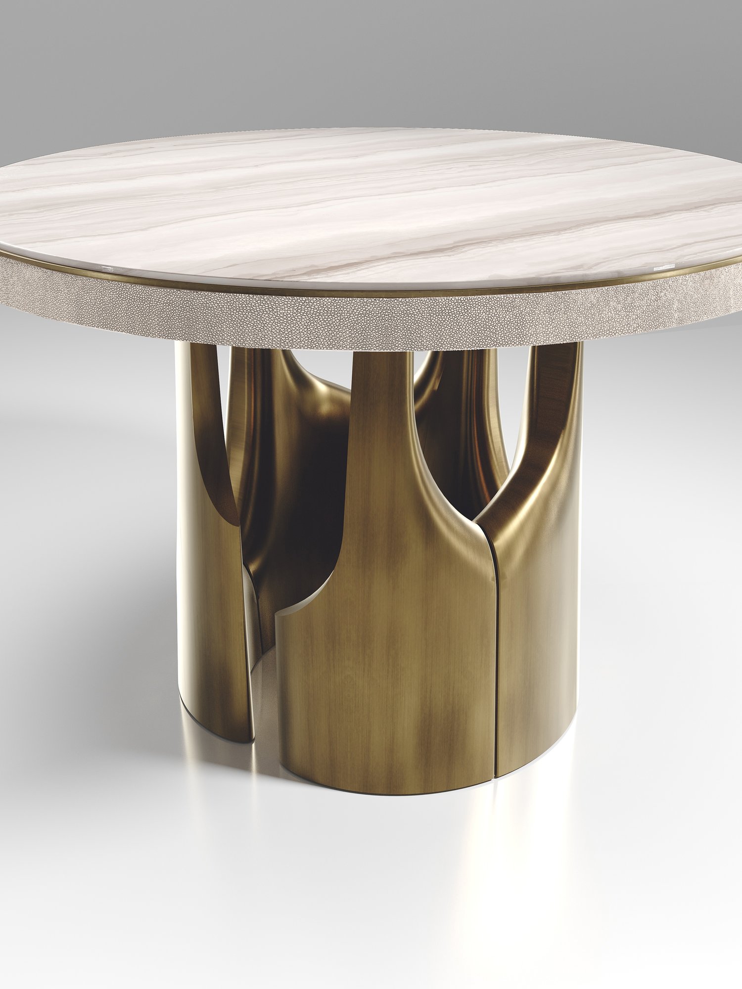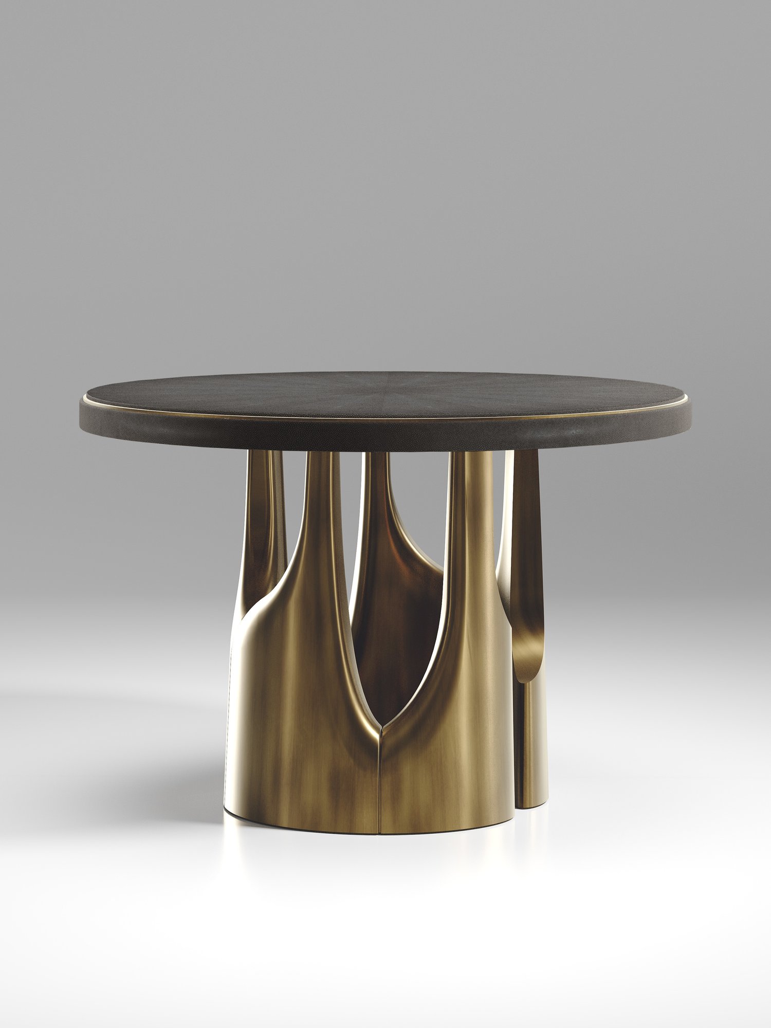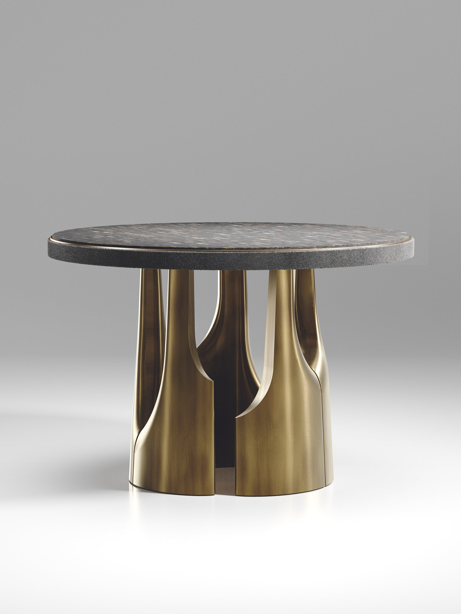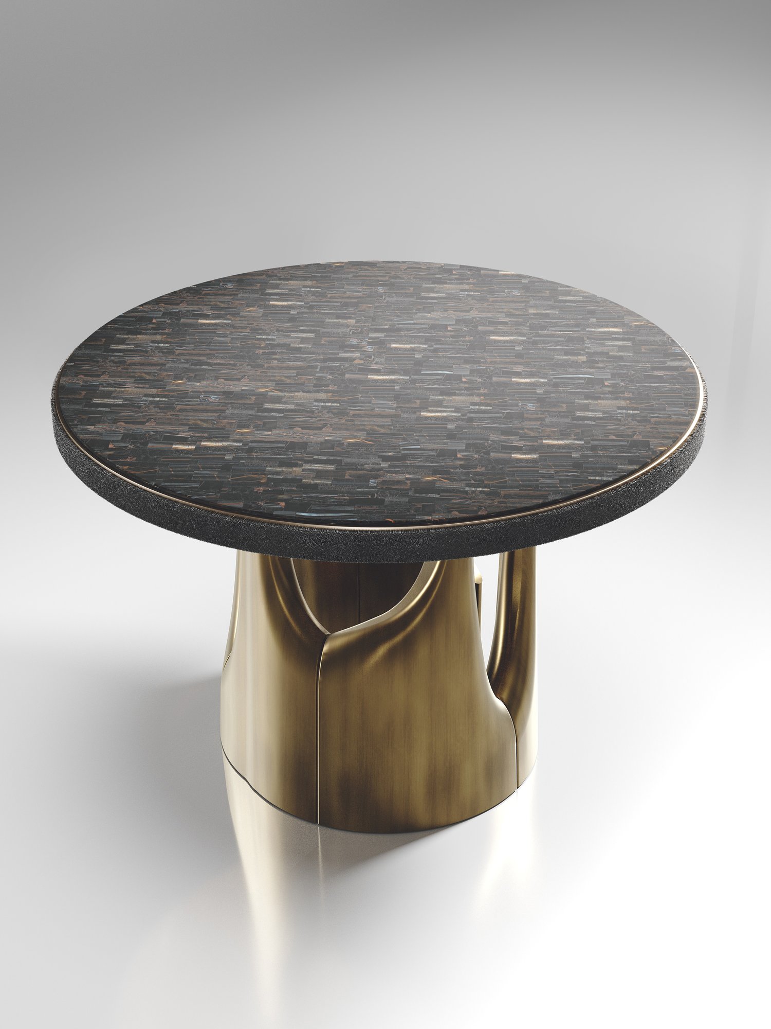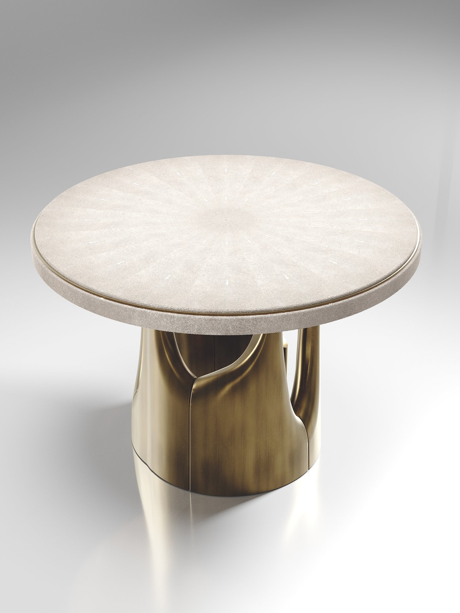 The Triptych Breakfast Table by R&Y Augousti is a stunning multi-faceted sculptural piece. The beautiful hand craved details on the bronze-patina base demonstrate the incredible artisan work of Augousti.
