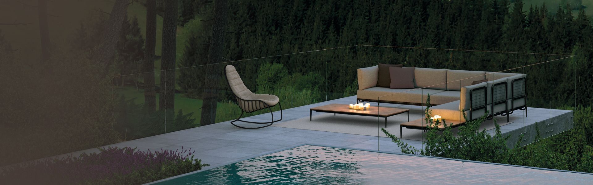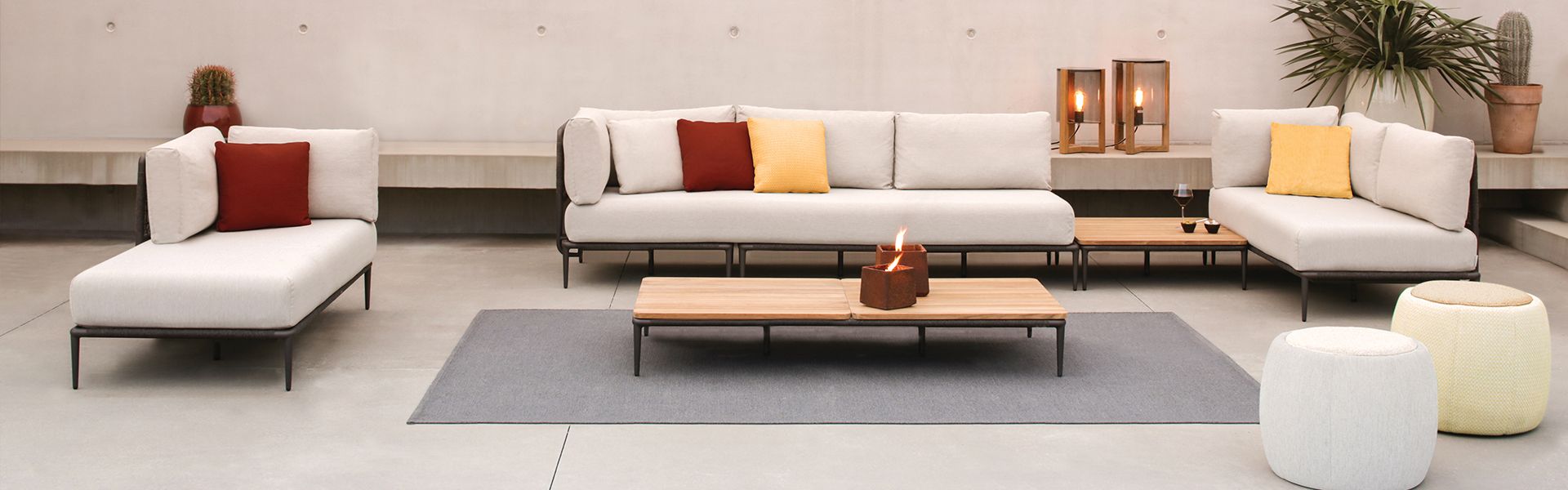 The light and airy frames, of this playful concept are available in white and bronze. Cushions come in a wide range of colours and textures, and all have a QuickDry filling.