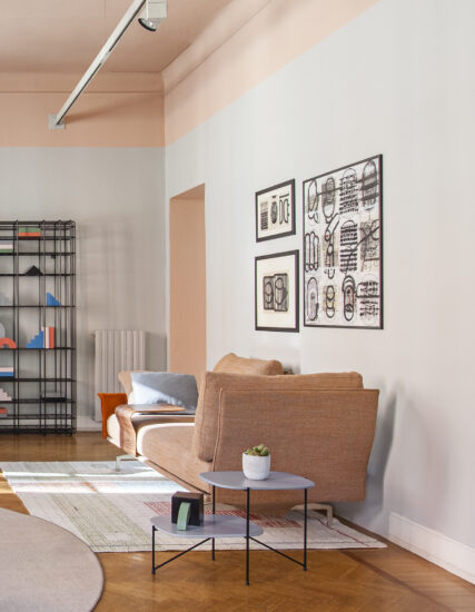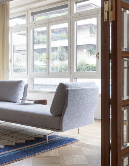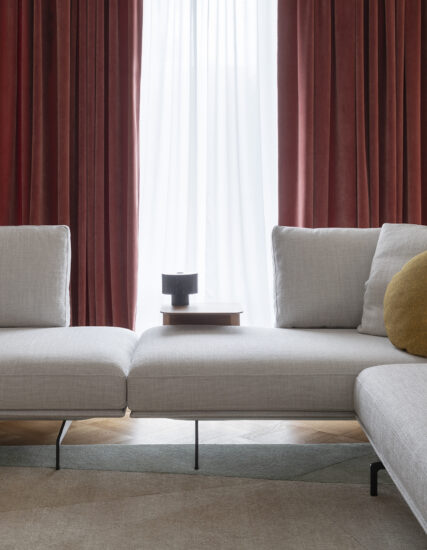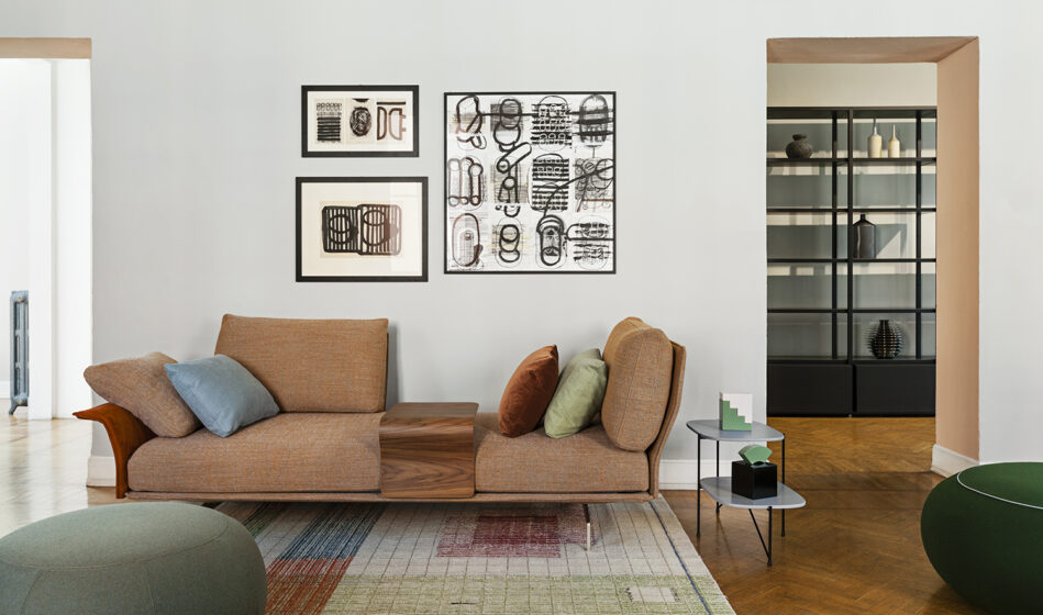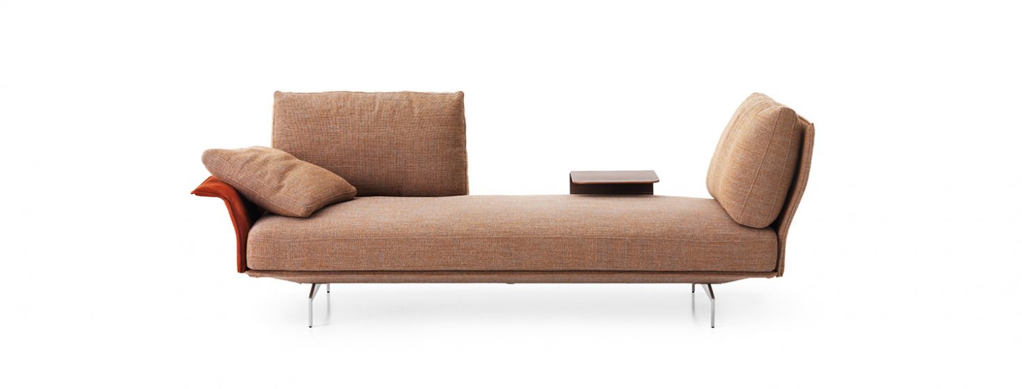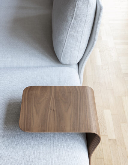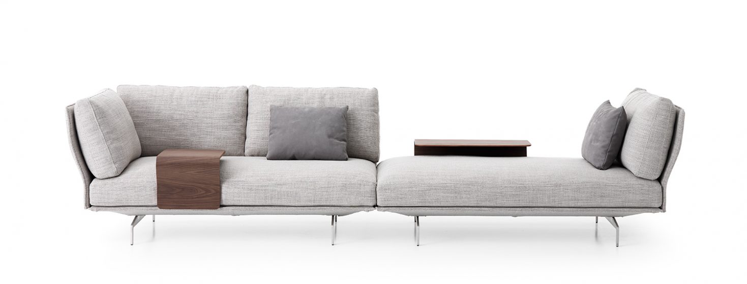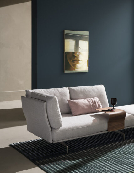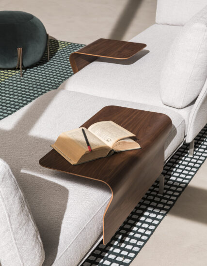 Flow, adapt, create void, rearrange space, receive and renew indefinitely. The new Avant-Après seating is able to do it all. Rigid yet lightweight, the sofa comes in fascinating configurations thanks to the special and unique armrest/backrest system that detaches with a simple movement and may be positioned all along the base. A pre-and-post dance that can be staged every day, created by the desire to try something new. Avant-Après has a sober allure and an elegant appearance. The seating is placed on a metal base upholstered in fabric or leather, resting on metal feet. Refined accessories complete the system: the side tables are walnut wood and come in two different sizes, with the warm notes of the wood. Fully removable covers.