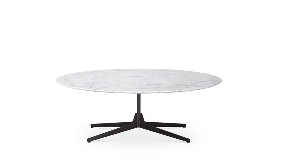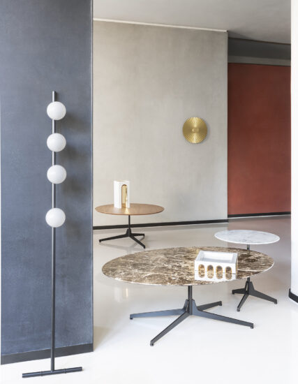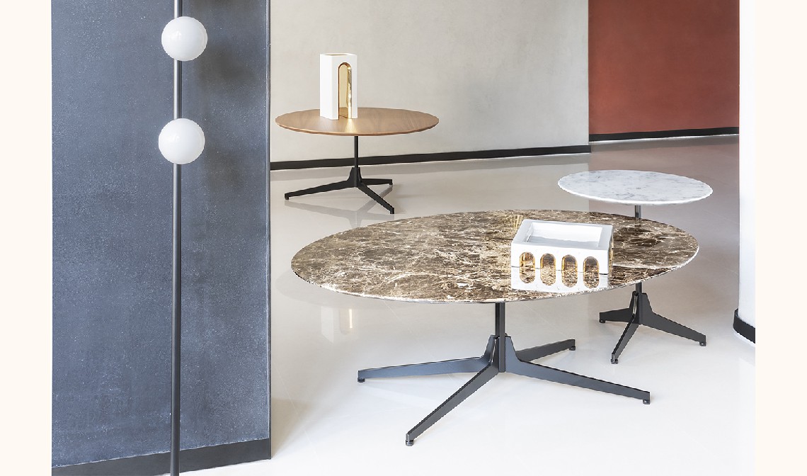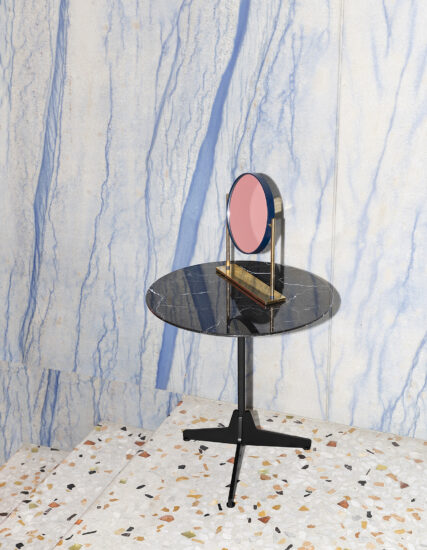 The project takes its inspiration from the concept of our memory, reimagining simple and iconic forms with echoes from the past. Central to the design is the upright hexagonal structure typically used in building construction that, in this particular context, is interpreted as a joint onto which the feet are attached perpendicularly. This style detail is reminiscent of 1950’s furniture design. The base of the table is painted finished metallic wire drawn and the top in marble.